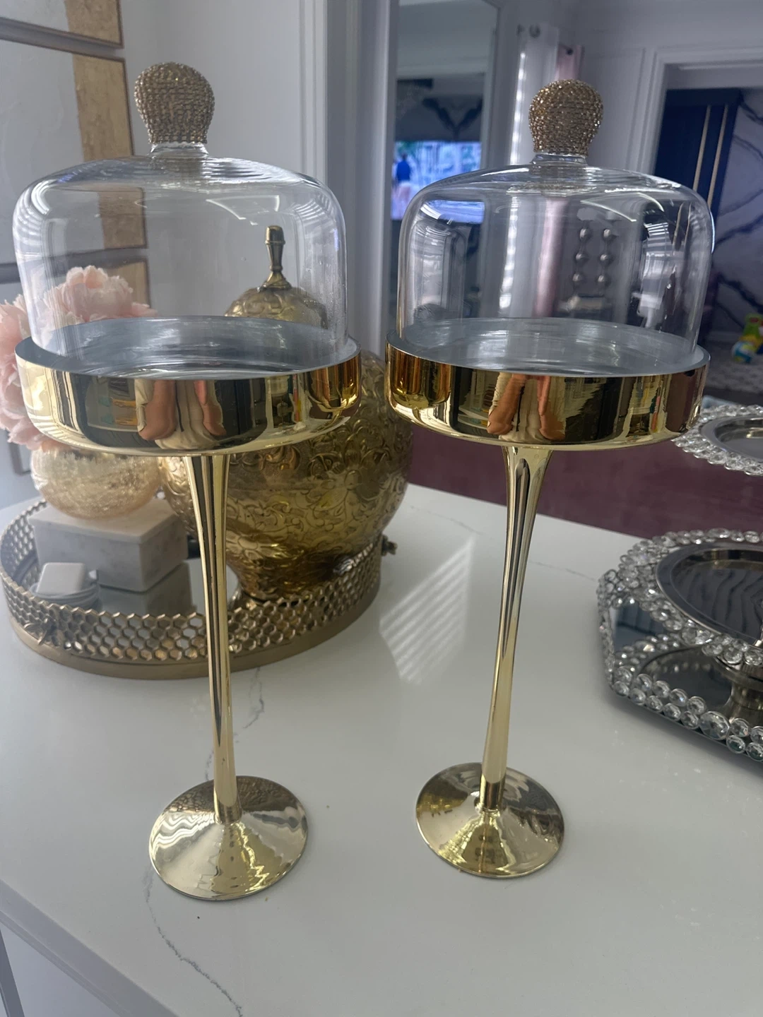Selling a set of two elegant gold pedestal dessert stands. These are perfect for displaying cupcakes, pastries, or other treats at your next party or event. The stands have a clear glass dome and a sturdy gold base.