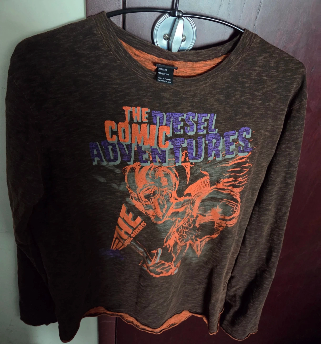 FREE a Diesel long sleeve shirt in size XXL. It's a brown colour and has a graphic design on the front. The shirt is made in Turkey. (Its more a large size)
