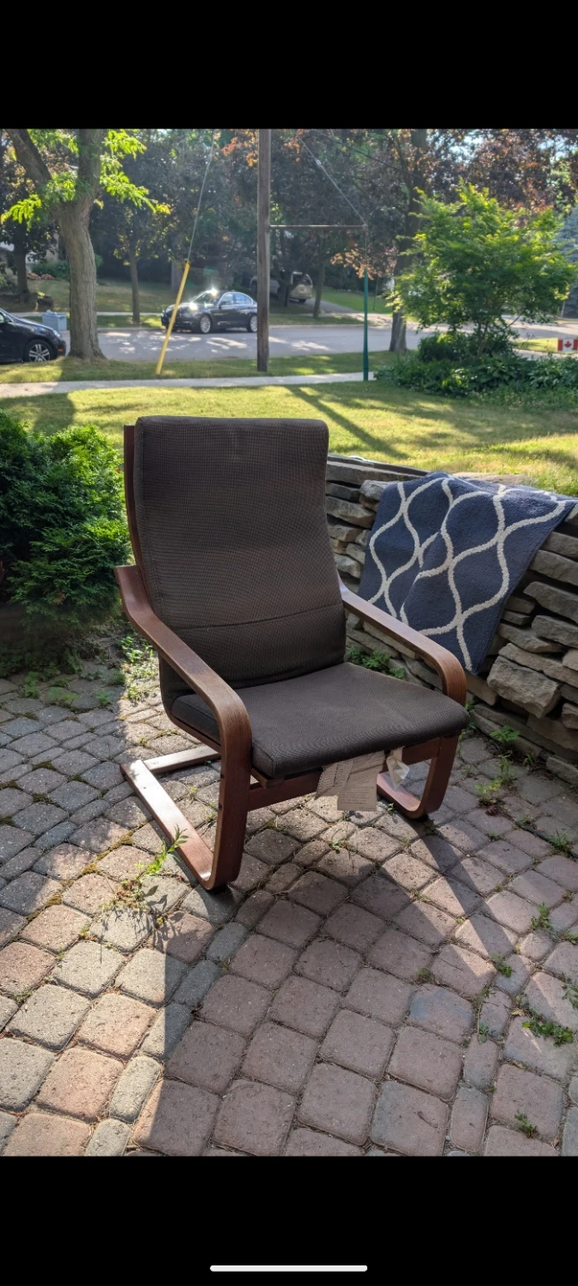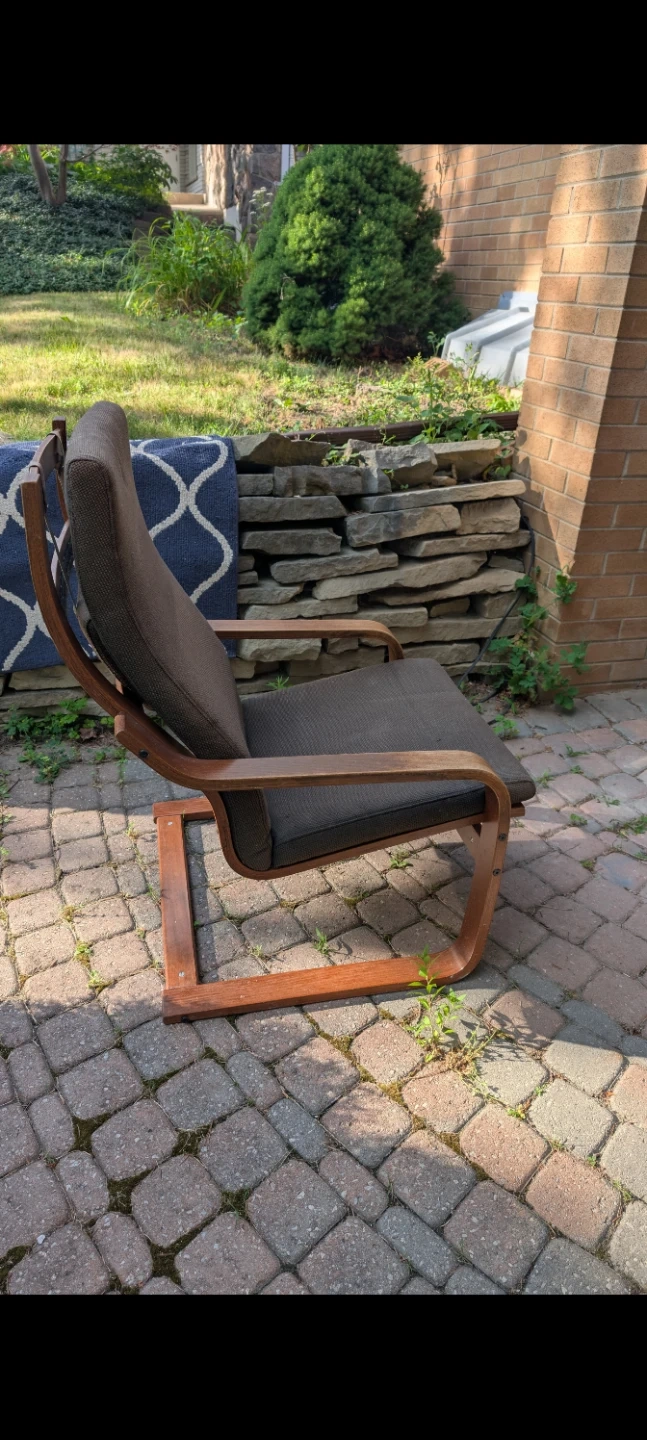 Selling a comfy brown armchair with a bentwood frame. It's in great shape and would look perfect in a living room or study! The chair has a unique design, and is very sturdy