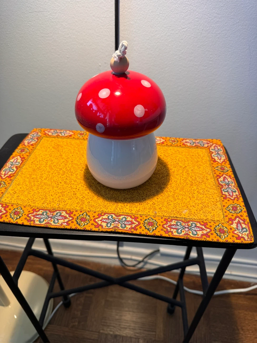 Selling a cute mushroom decoration It's red with white polka dots on top and a white base. It stands approximately 6 inches tall and would be a fun addition to any room