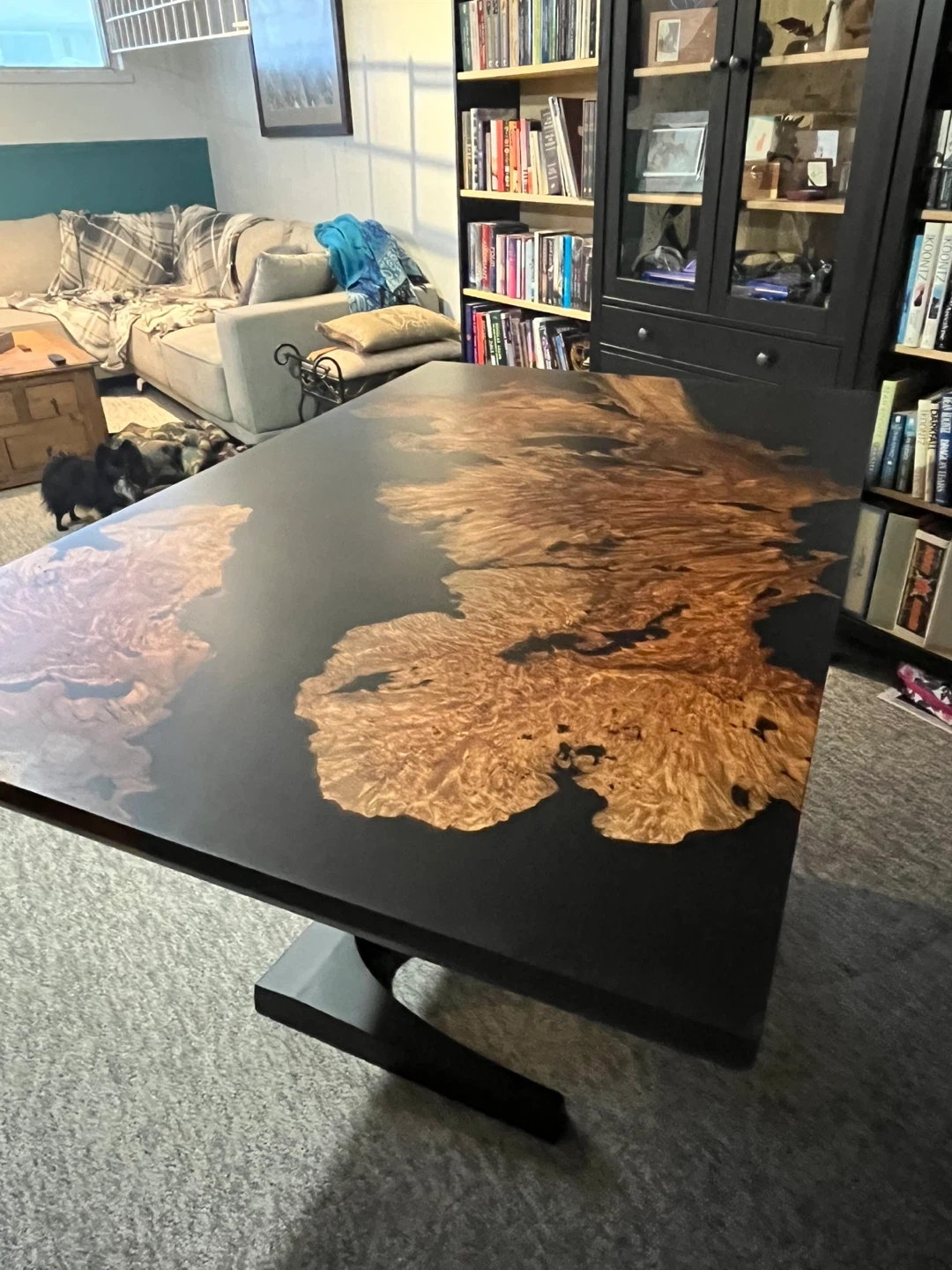 For the discerning buyer, this one of a kind, custom statement piece is exactly what you need! Maple burl wood and black resin, with elegant curved legs, easily seats six, and can seat up to 8 of your favourite people. Alternatively it could be used as a desk in your home office.