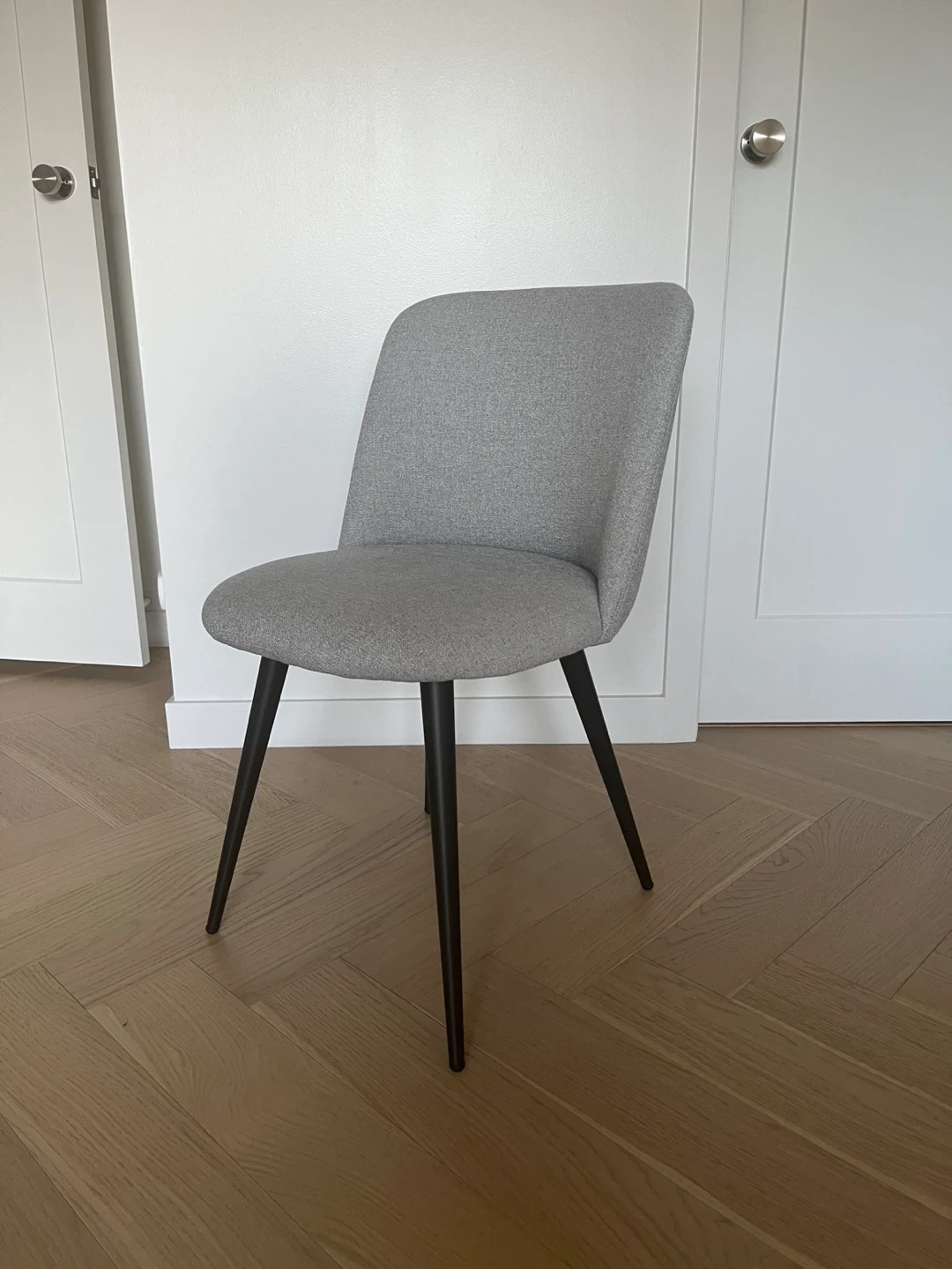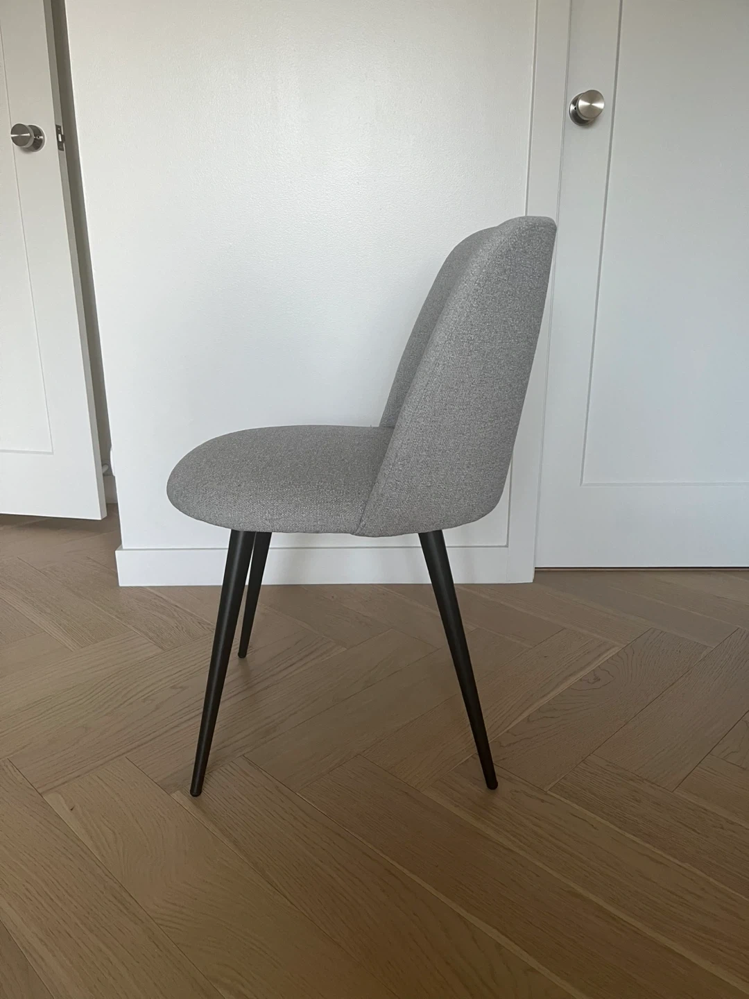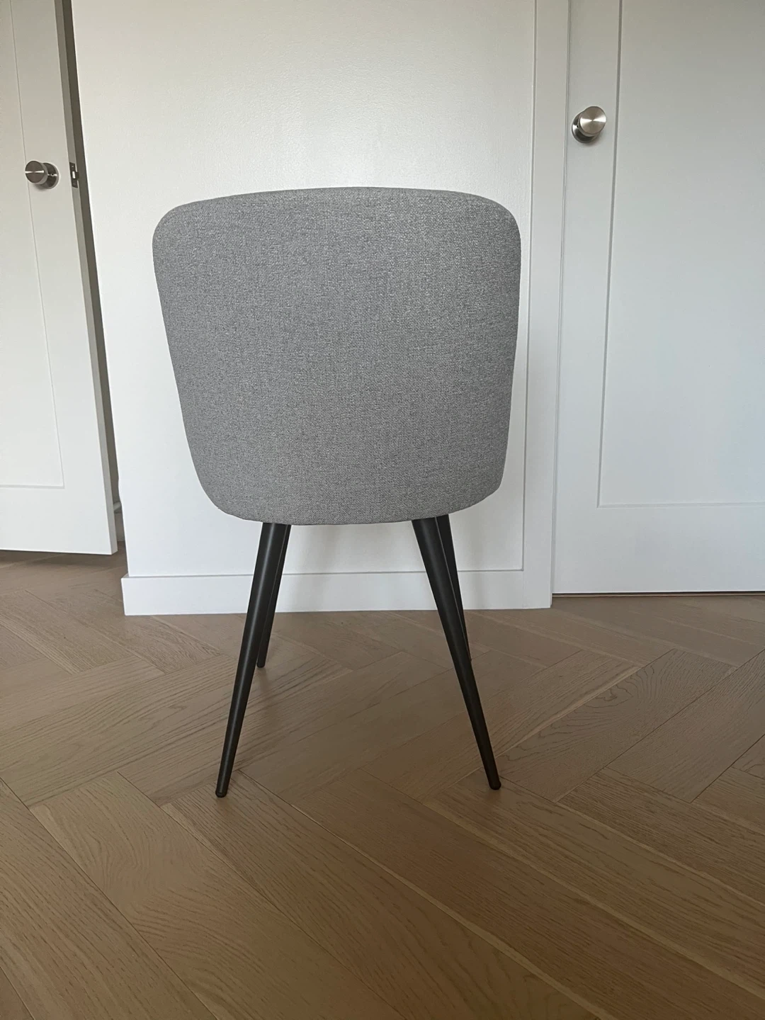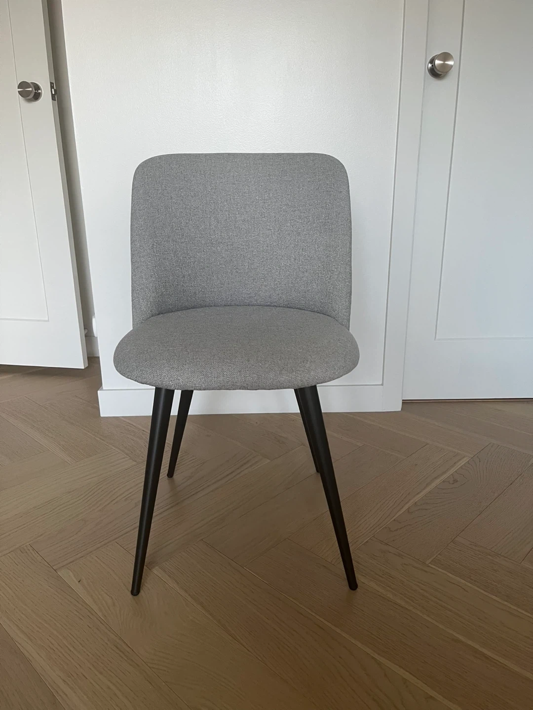 Selling a grey upholstered dining chair. It has black legs and a simple, modern design.