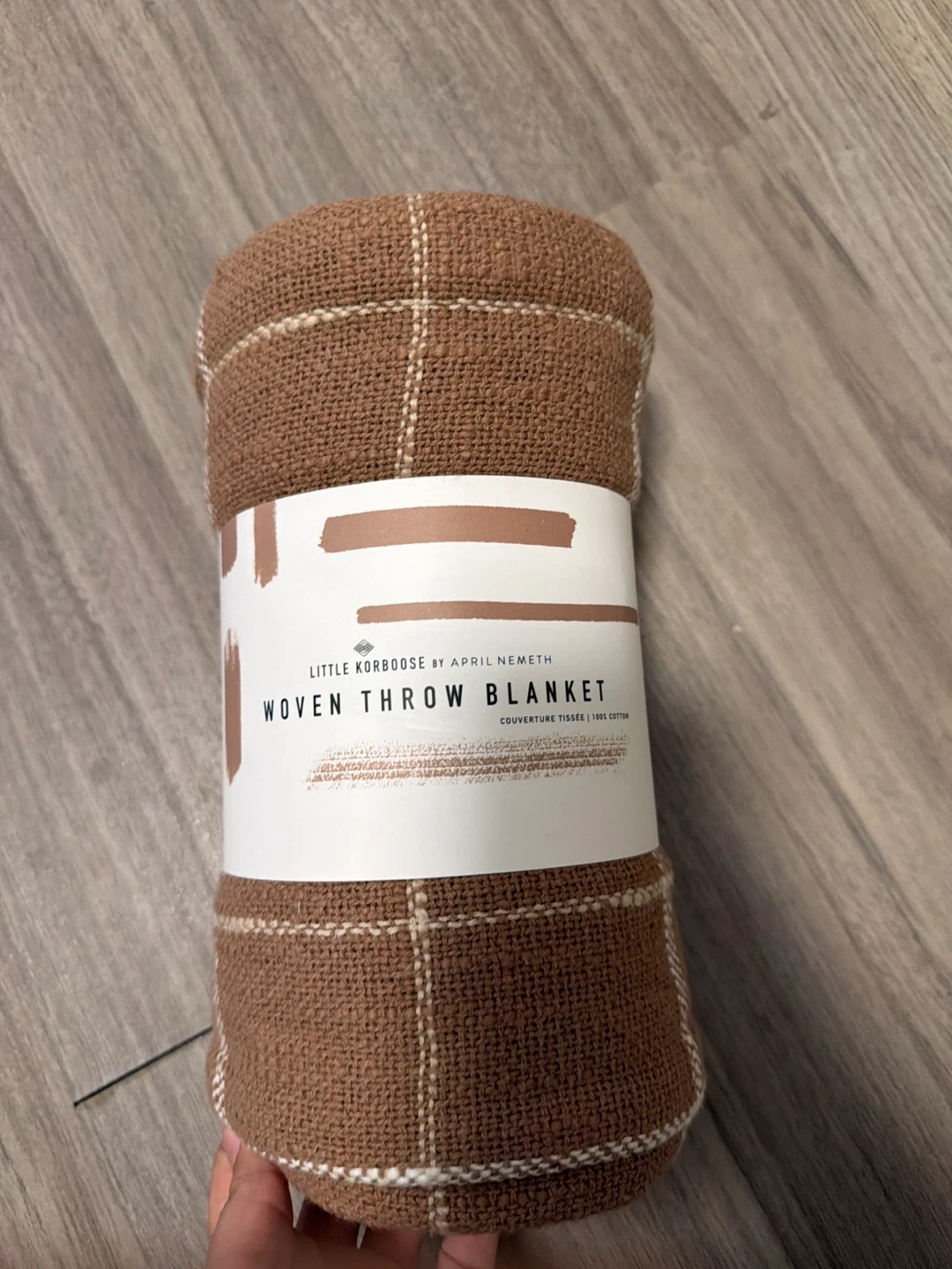 Selling a Little Korboose by April Nemeth woven throw blanket. It's a lovely brown colour with a subtle plaid pattern. The blanket is made of 100% cotton. Perfect for adding a cozy touch to your home!