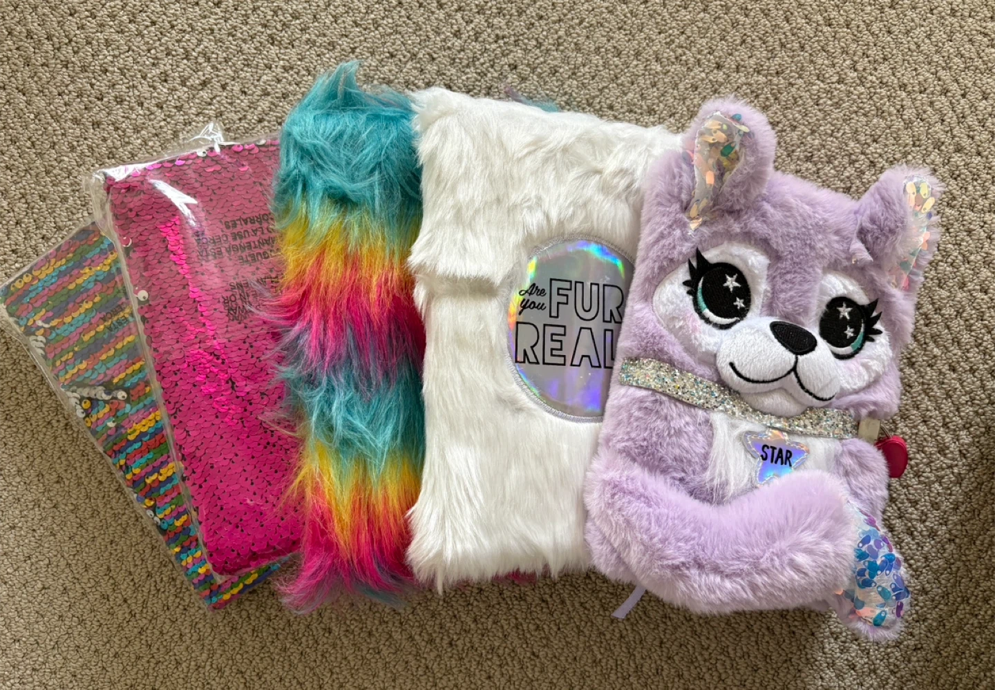 Check out these fun and unique journals! They're perfect for kids or anyone who loves a little sparkle and fuzz. There's a sequin journal, a rainbow fuzzy journal, a white fuzzy journal, and a cute purple plush journal. The inside pages are lined and ready for writing or drawing!