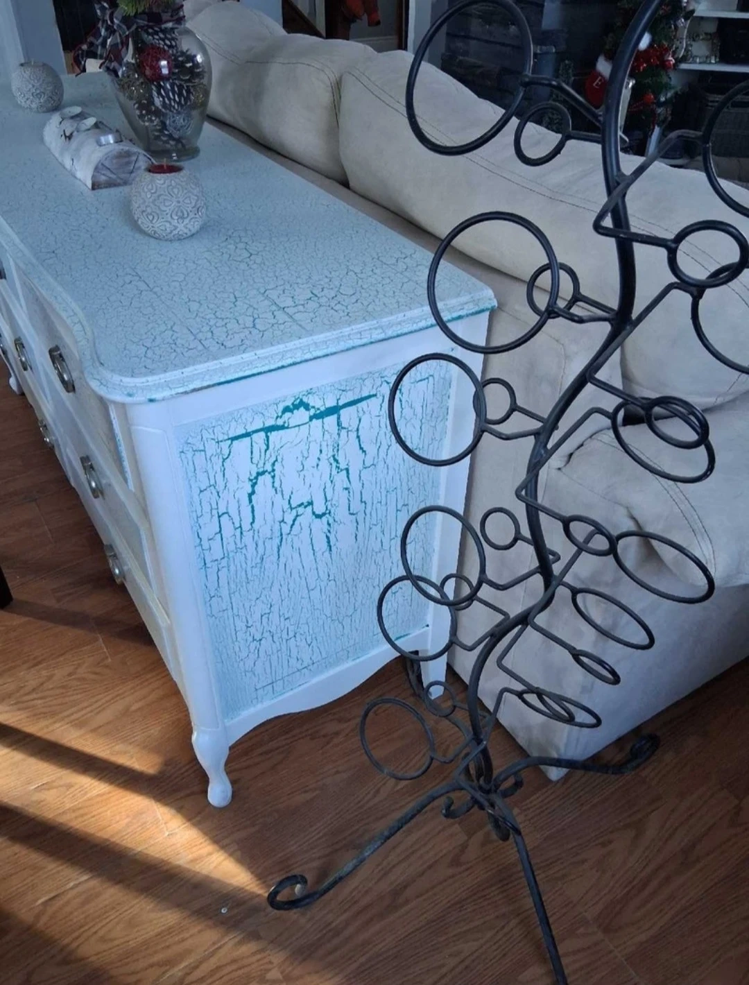 Selling a lovely white dresser with nine drawers. It has a unique crackle finish on top and a classic design that would look great in any bedroom. It's in good condition and ready for a new home!