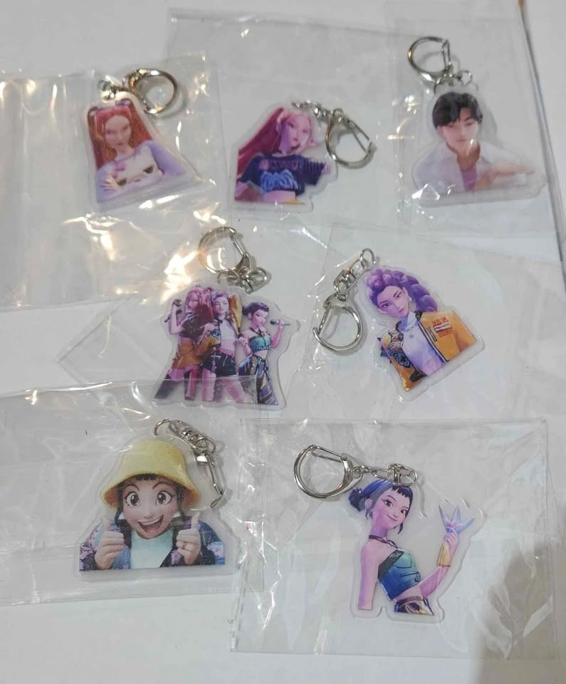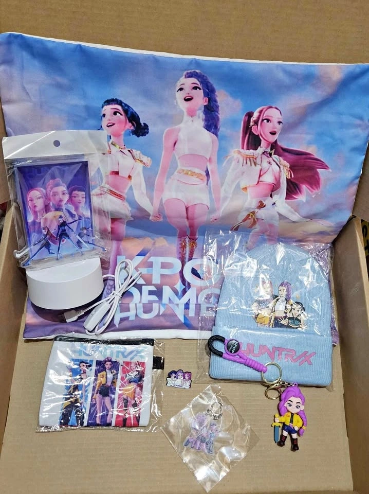 Build your own Kpop Demon Hunters mystery box. Or as it comes complete mystery built. 7 items in total. One light, pillow case, beanie, bag clip, keychain, enamel pin and coin purse. $50 for one mystery box. Items sold separately as well. Prices separate below.