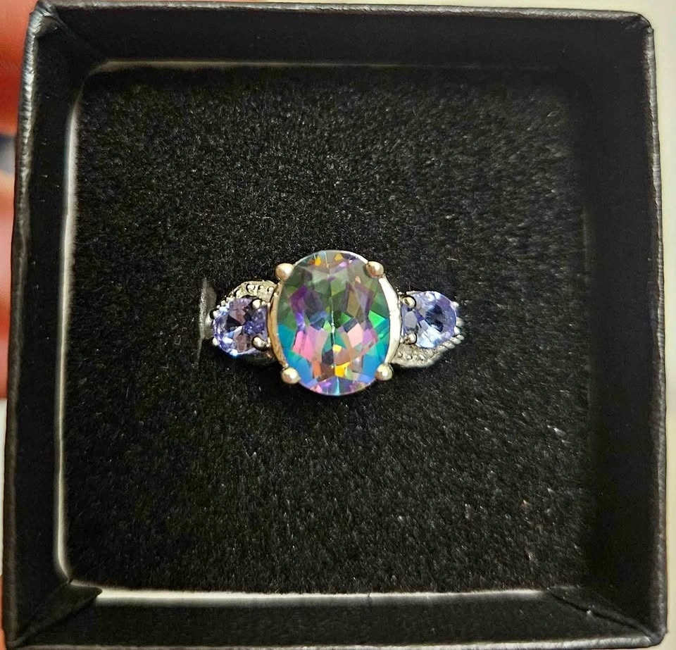 Gorgeous Womens 14K White Gold Over Solid Sterling Silver Diamonds 0.7 CTW Tanzanite and 3.25 CTW Mystic Topaz Size 7 Designer Ring RETAIL VALUE 2K. Accepting best offers. Feel free to message ☺️