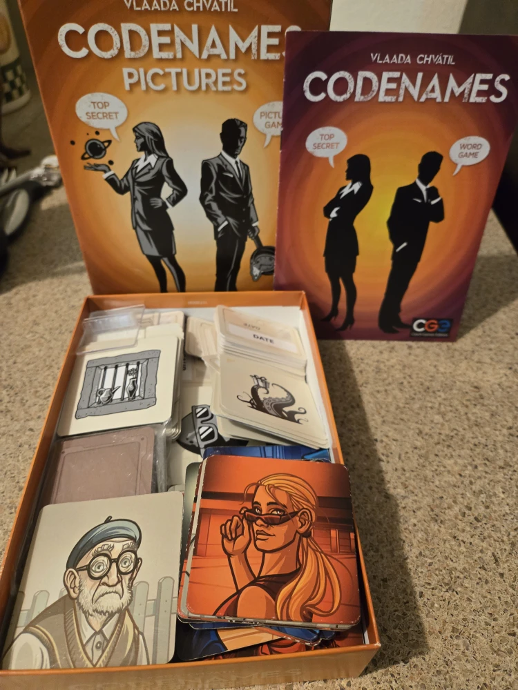 Selling both Codenames Pictures and the original Codenames word game together! Both games are in good used condition and come with one box and component for both. Hours of fun for game nights!