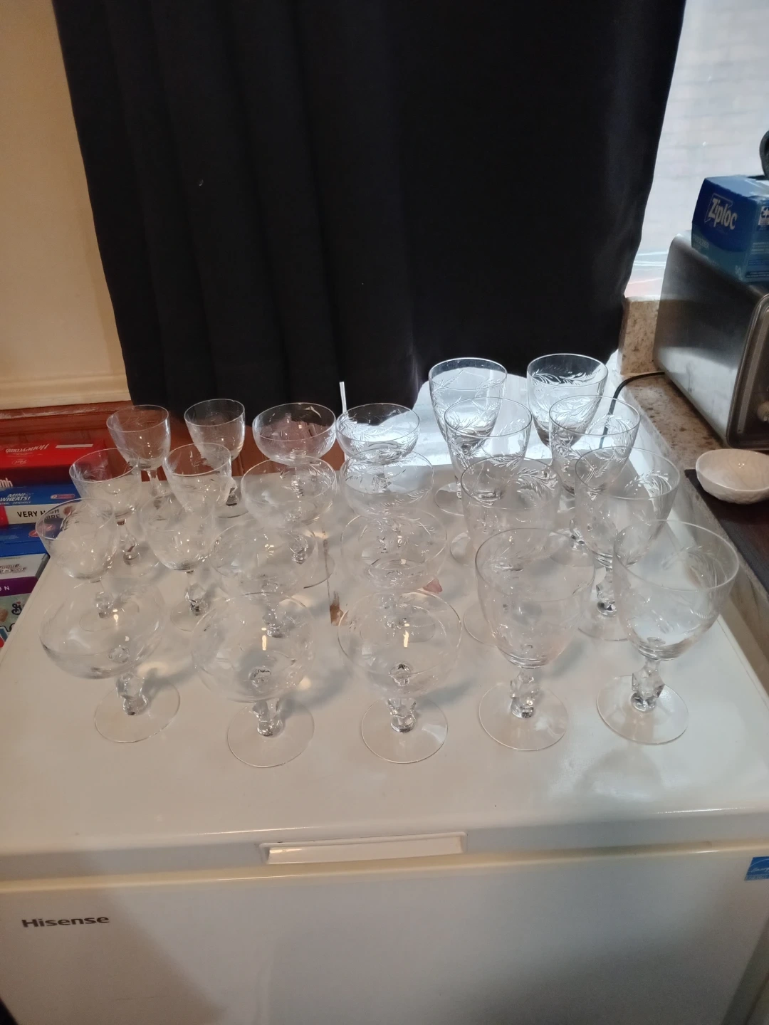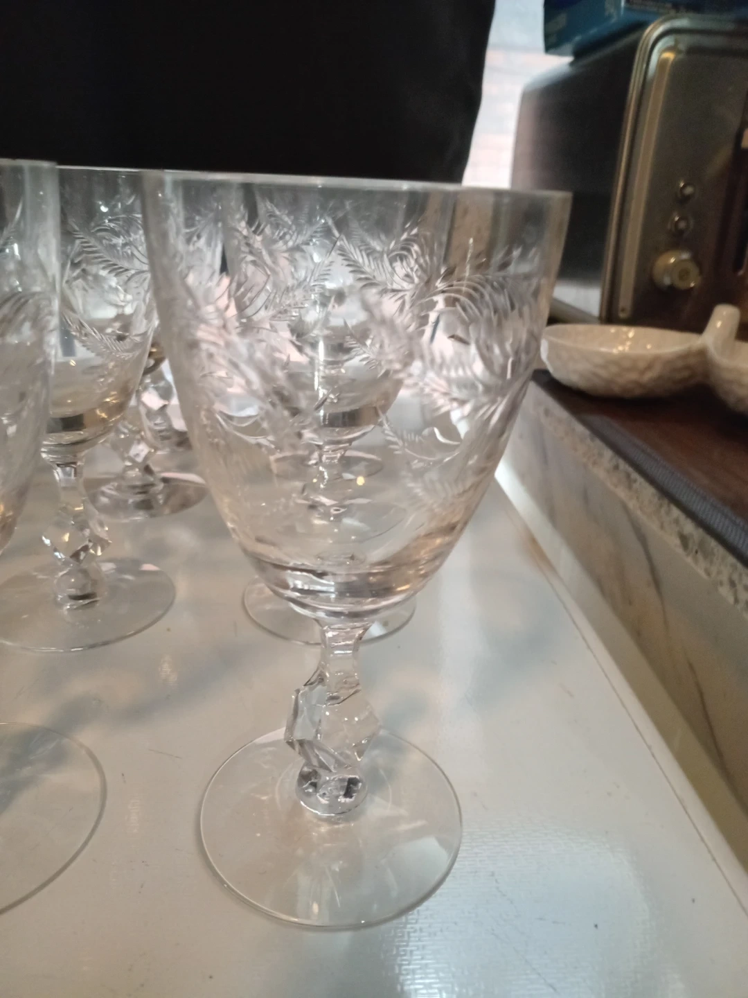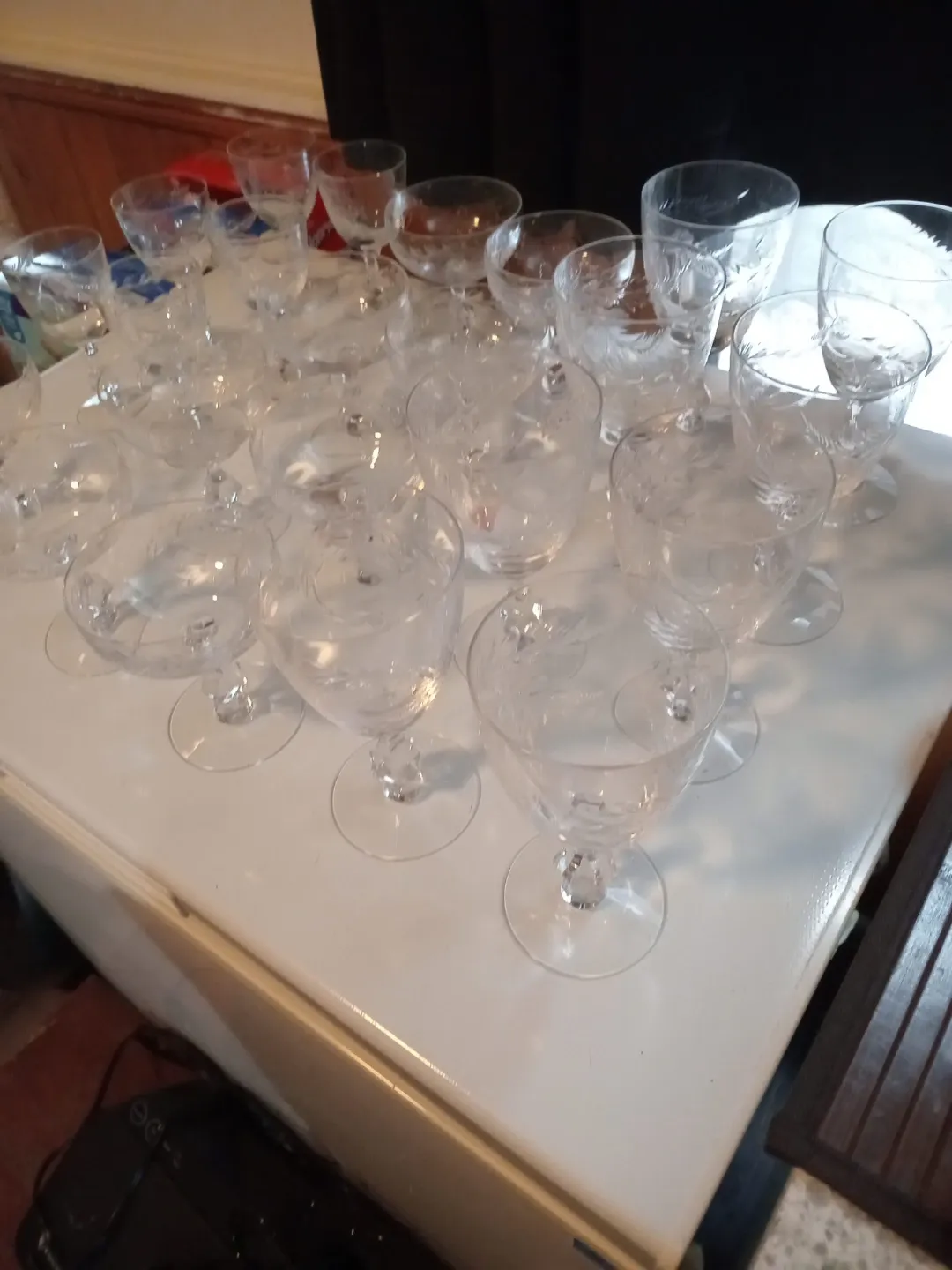 Selling a set of 24 vintage crystal wine glasses. They feature a delicate etched floral design and a unique faceted stem. These glasses would add a touch of elegance to any table setting