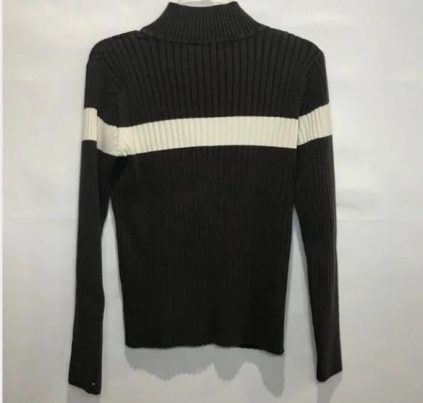 It's a brown, ribbed knit with a white stripe across the chest.
