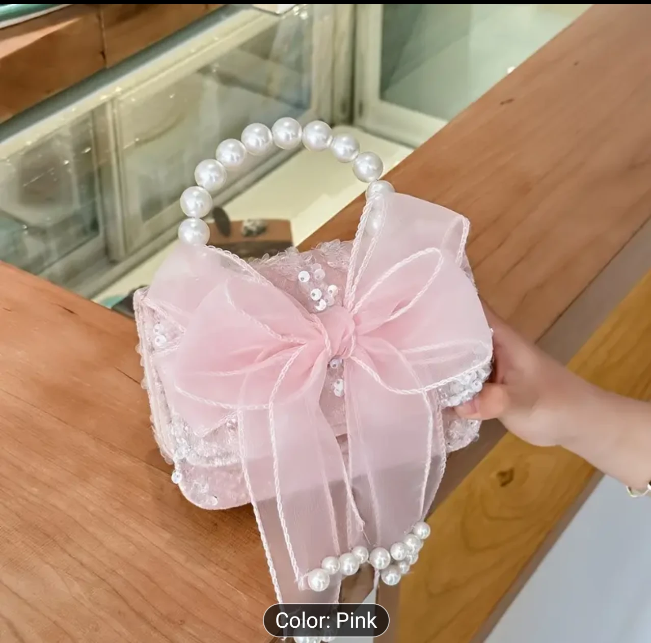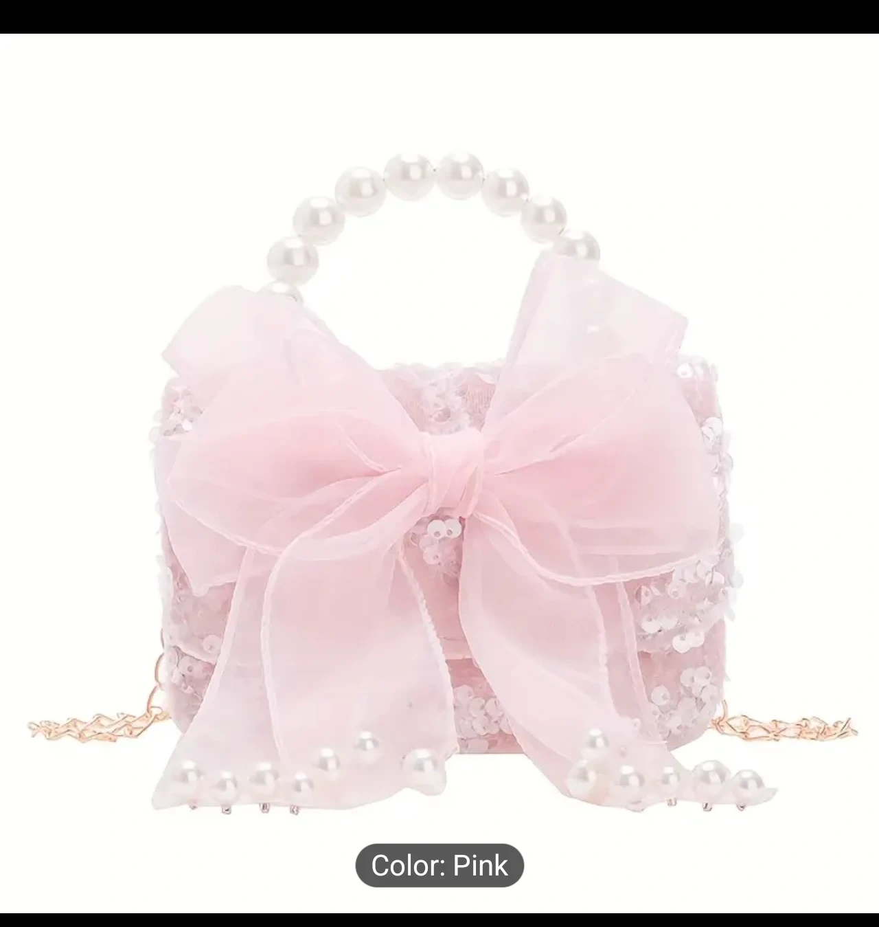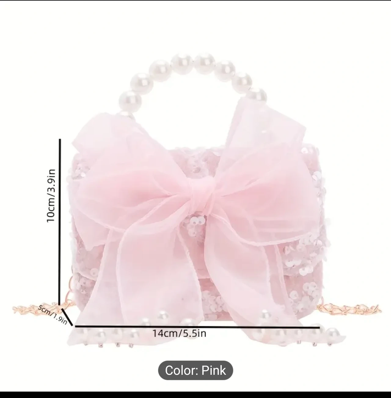 Check out this adorable pink shoulder bag! It features a cute bowknot design and a pearl handle. The bag is approximately 10cm/3.9in in height and 14cm/5.5in in width, perfect for little treasures.