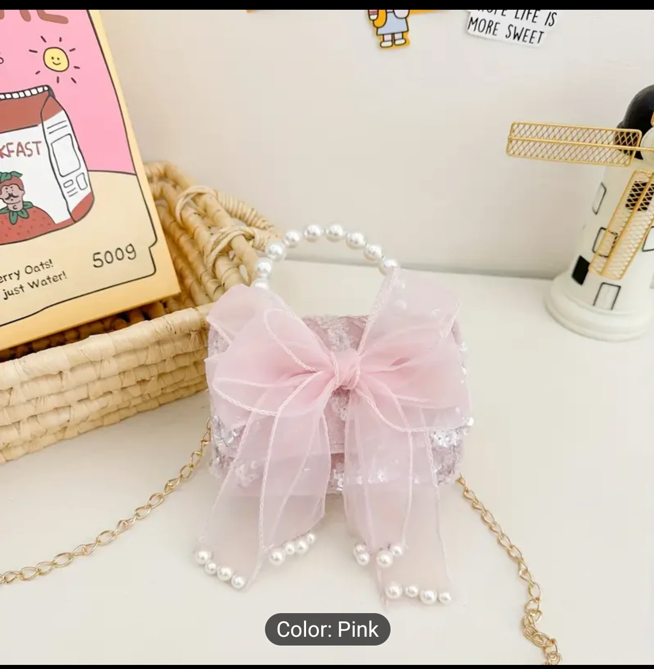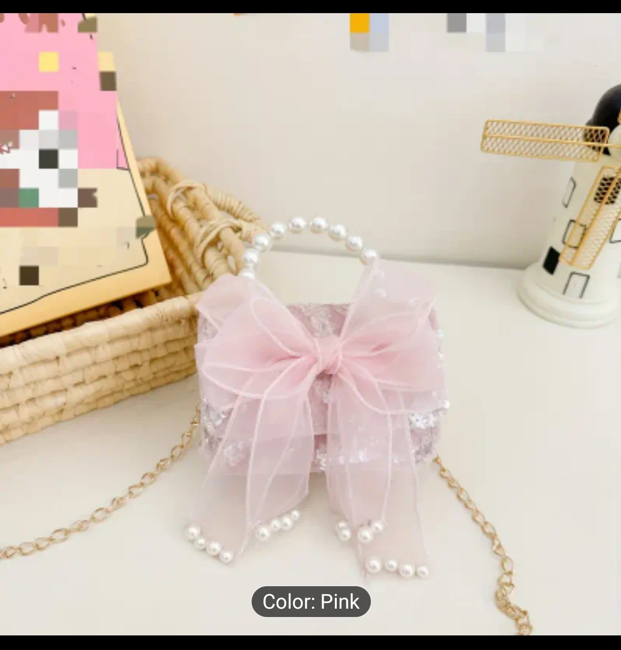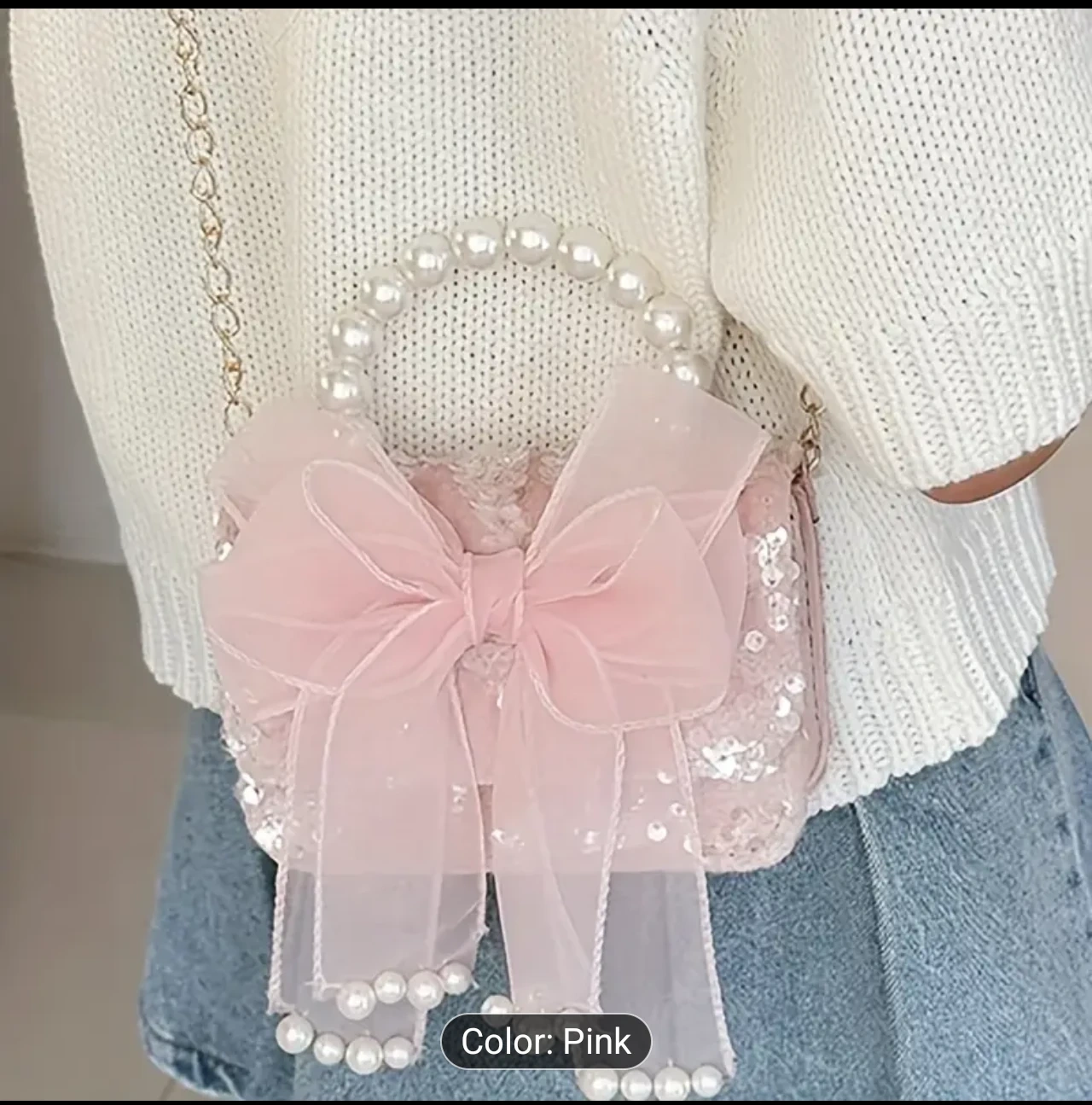 Check out this adorable pink shoulder bag! It features a cute bowknot design and a pearl handle. The bag is approximately 10cm/3.9in in height and 14cm/5.5in in width, perfect for little treasures.