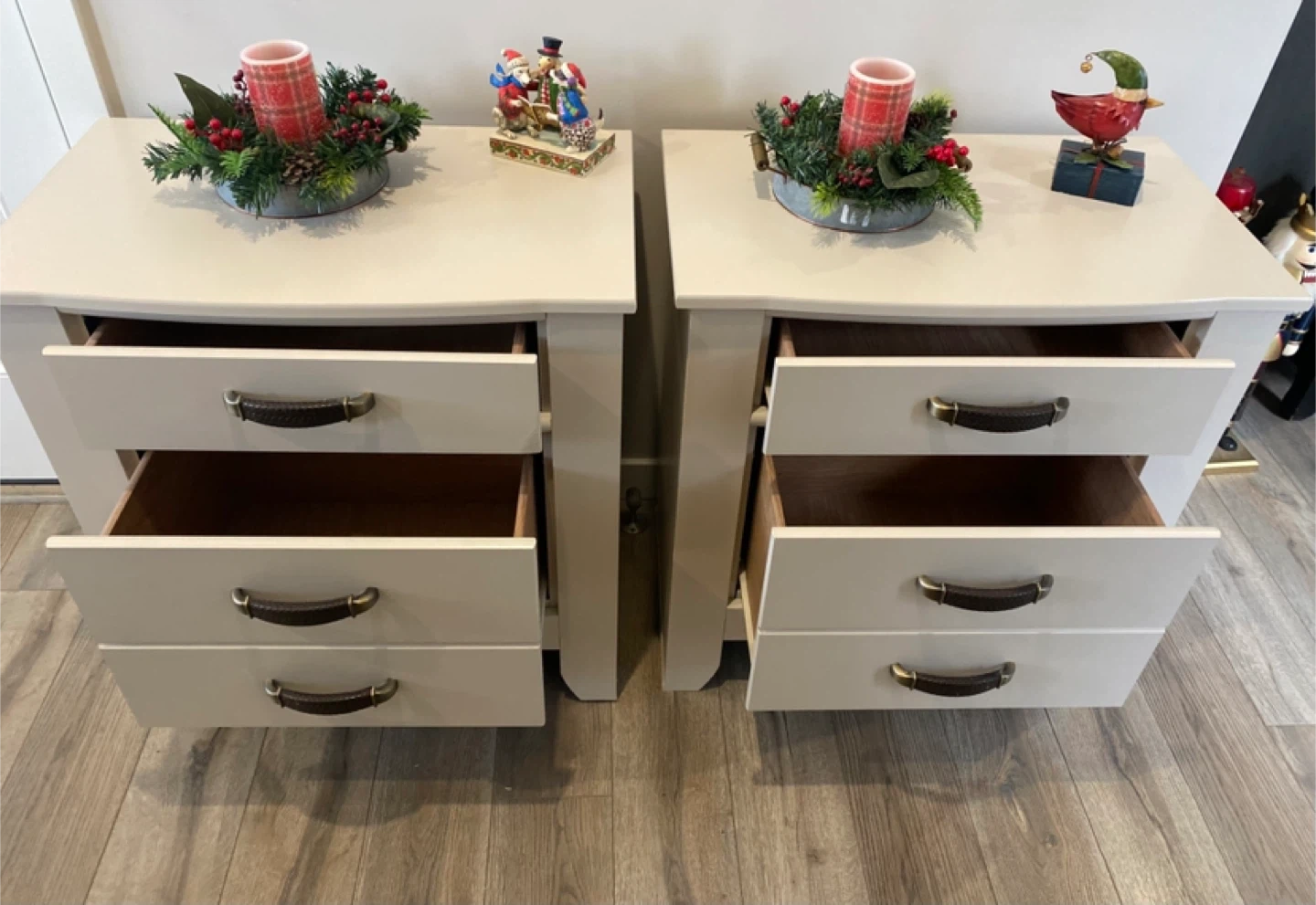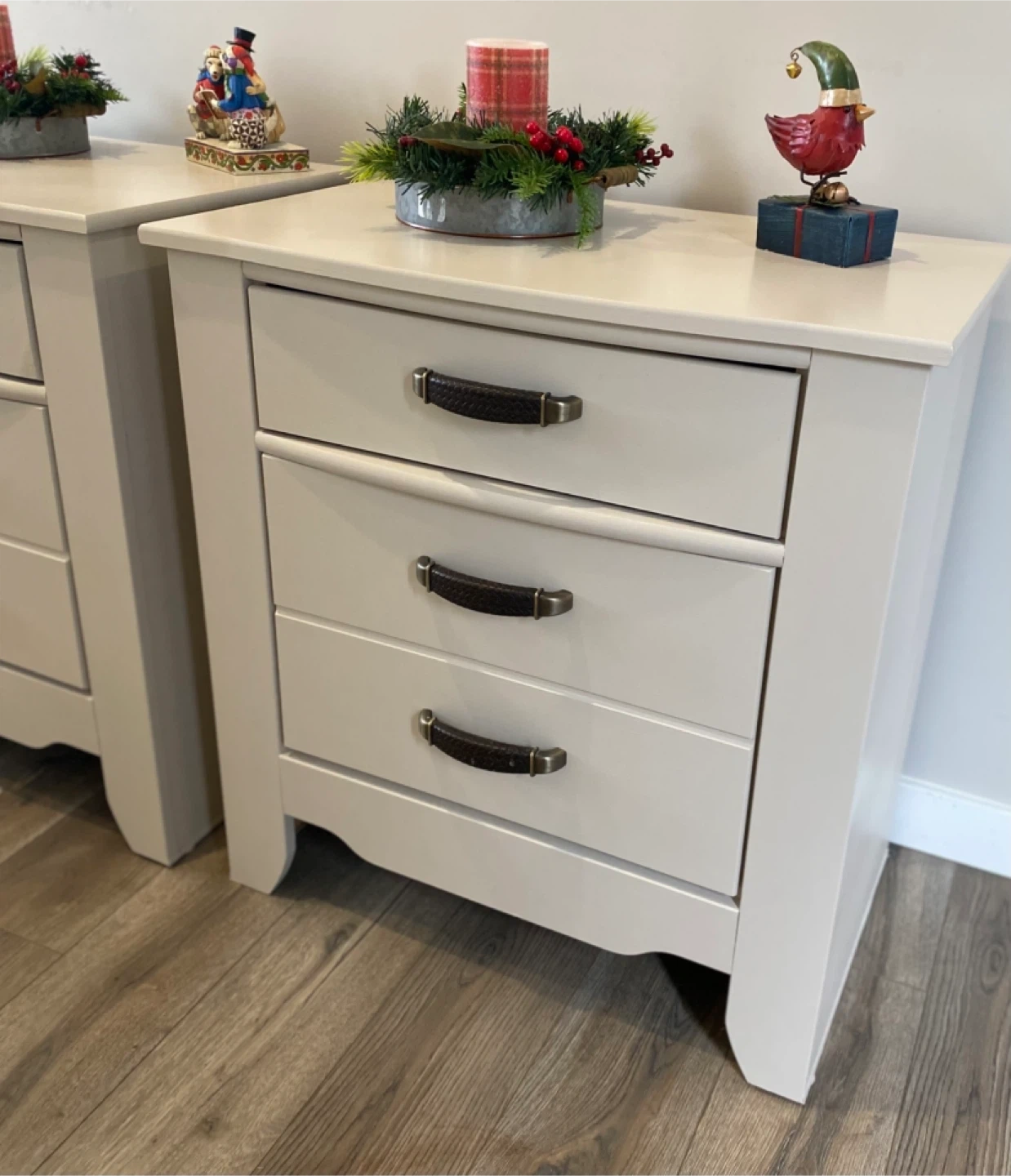 Beautiful pair of king nightstands painted in a warm off-white called Cashmere with Satin clear coatings