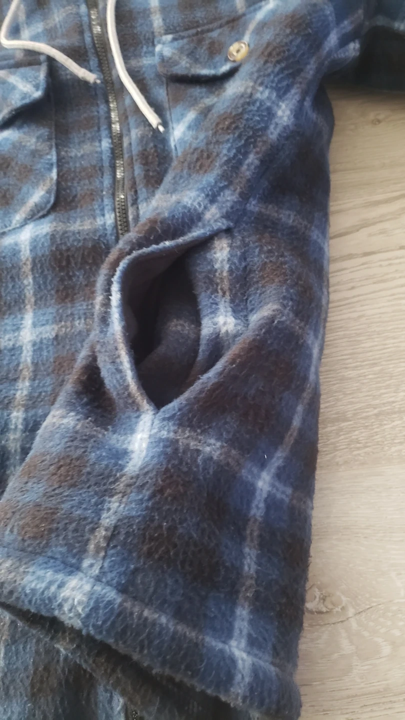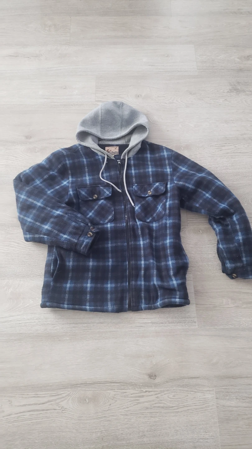 Cozy Ranch Gear hooded flannel jacket in size M! It's blue and black plaid with a soft, sherpa-like lining. Perfect for staying warm on chilly days!