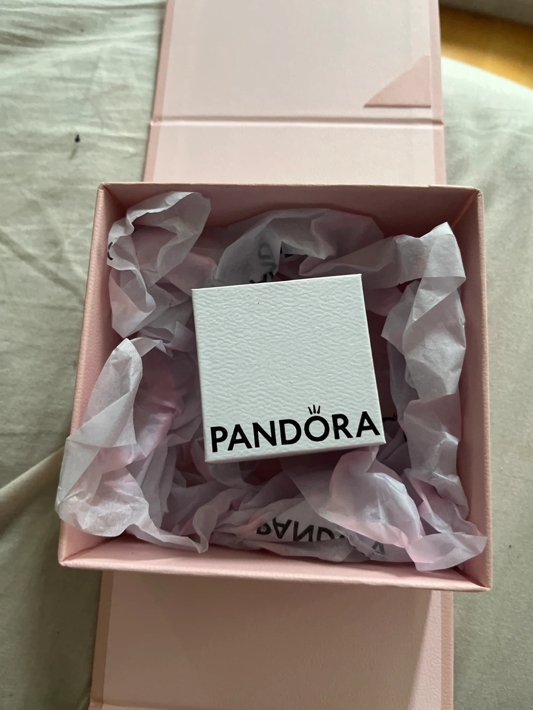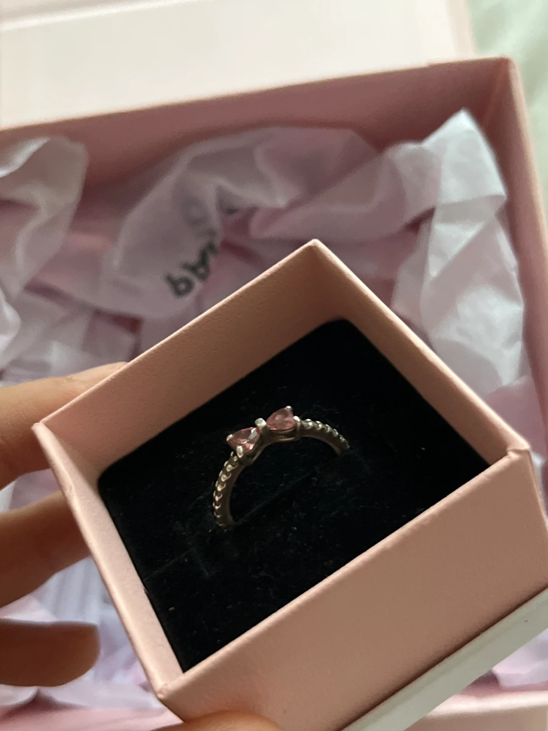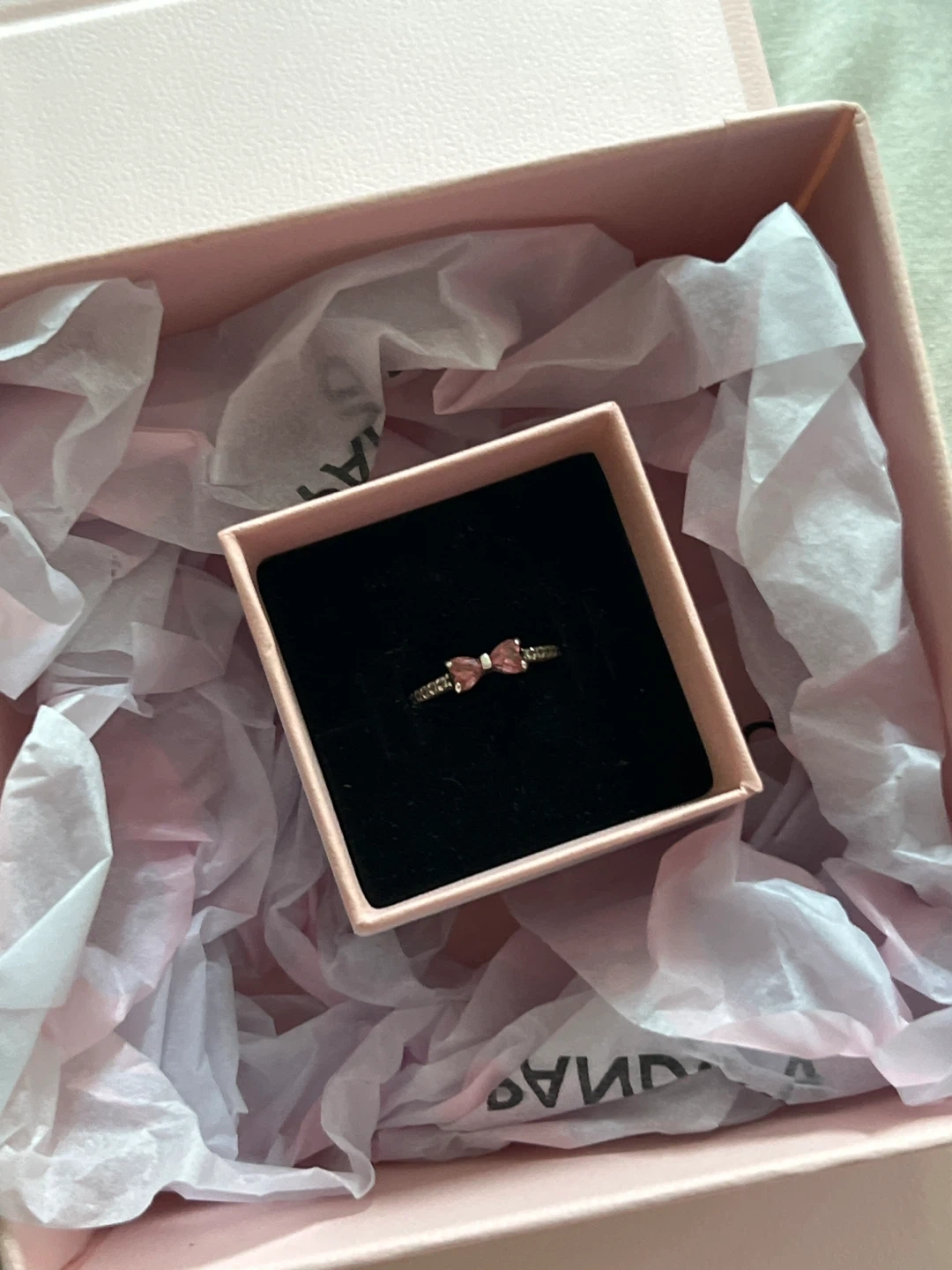 Selling a cute Pandora ring with a pink bow design. It comes with the original box! Mint condition, box just doesn’t have the ribbon anymore.
