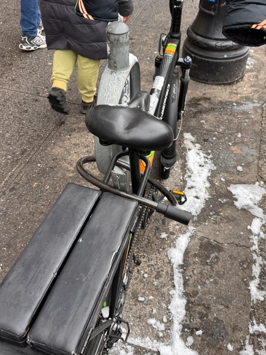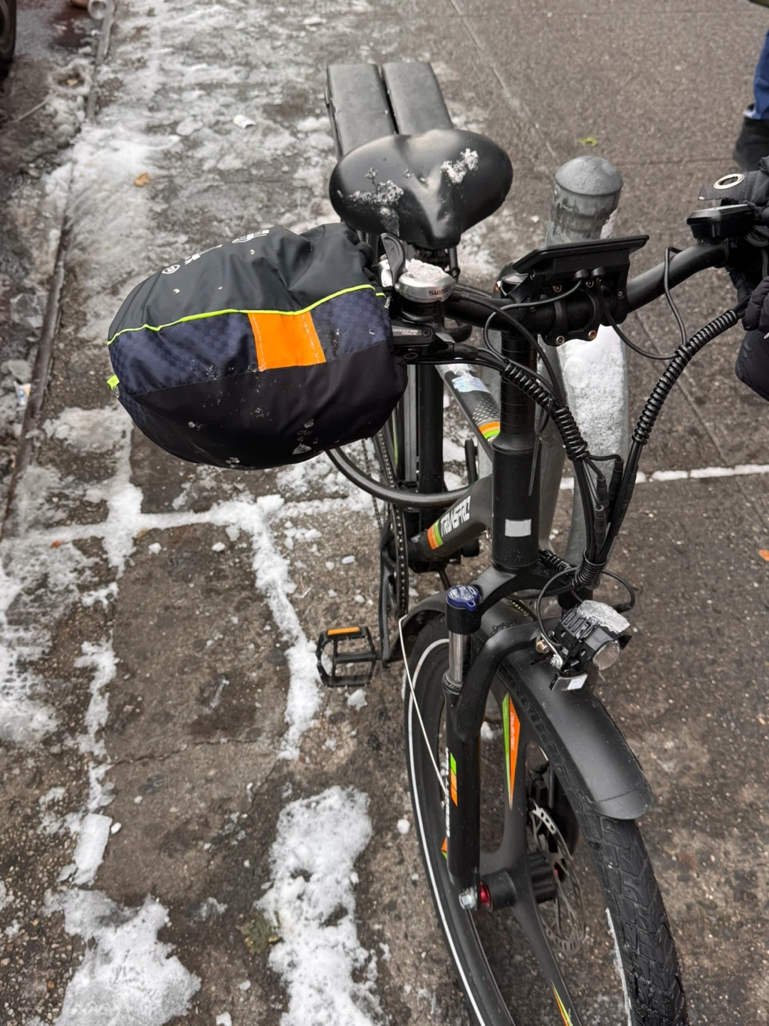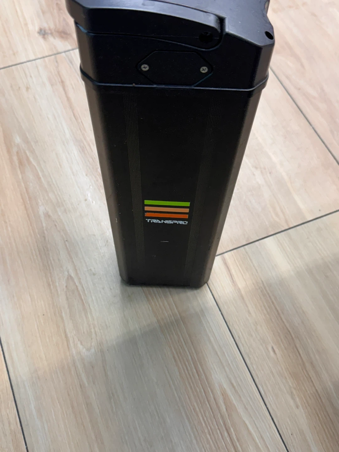 Selling a Transpro electric bike. It has a black frame with orange and green accents. The bike is used but still in good condition for getting around town.One month of use