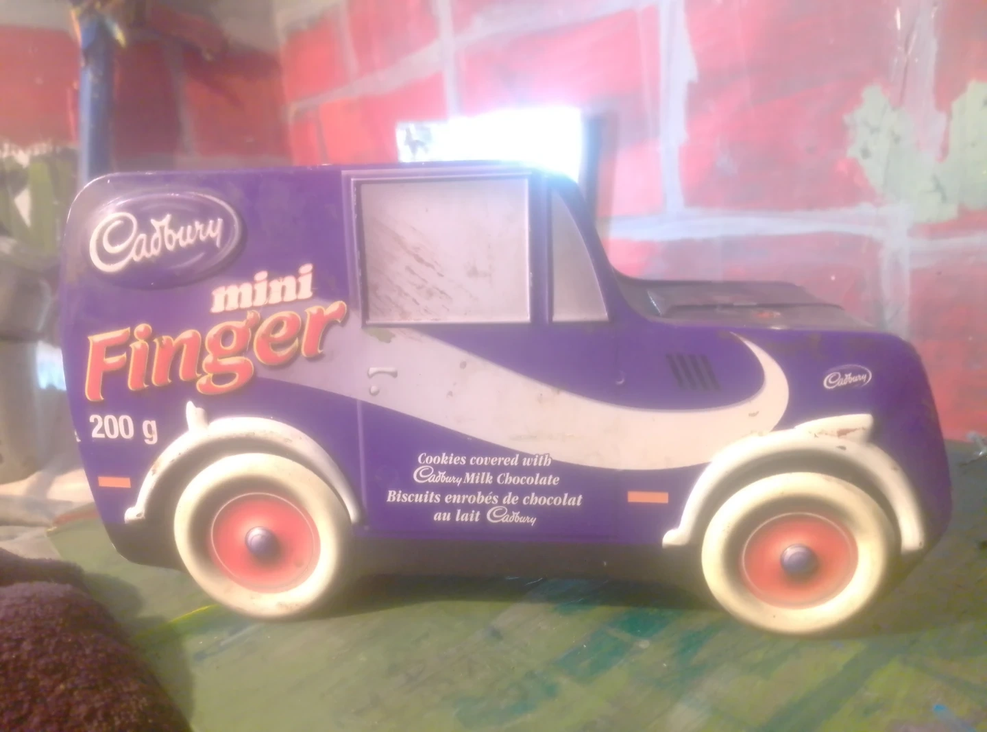 Cadbury Mini Finger tin shaped like a van. It contains 200g of cookies covered with Cadbury Milk Chocolate. This tin would be a fun keepsake after enjoying the treats inside!