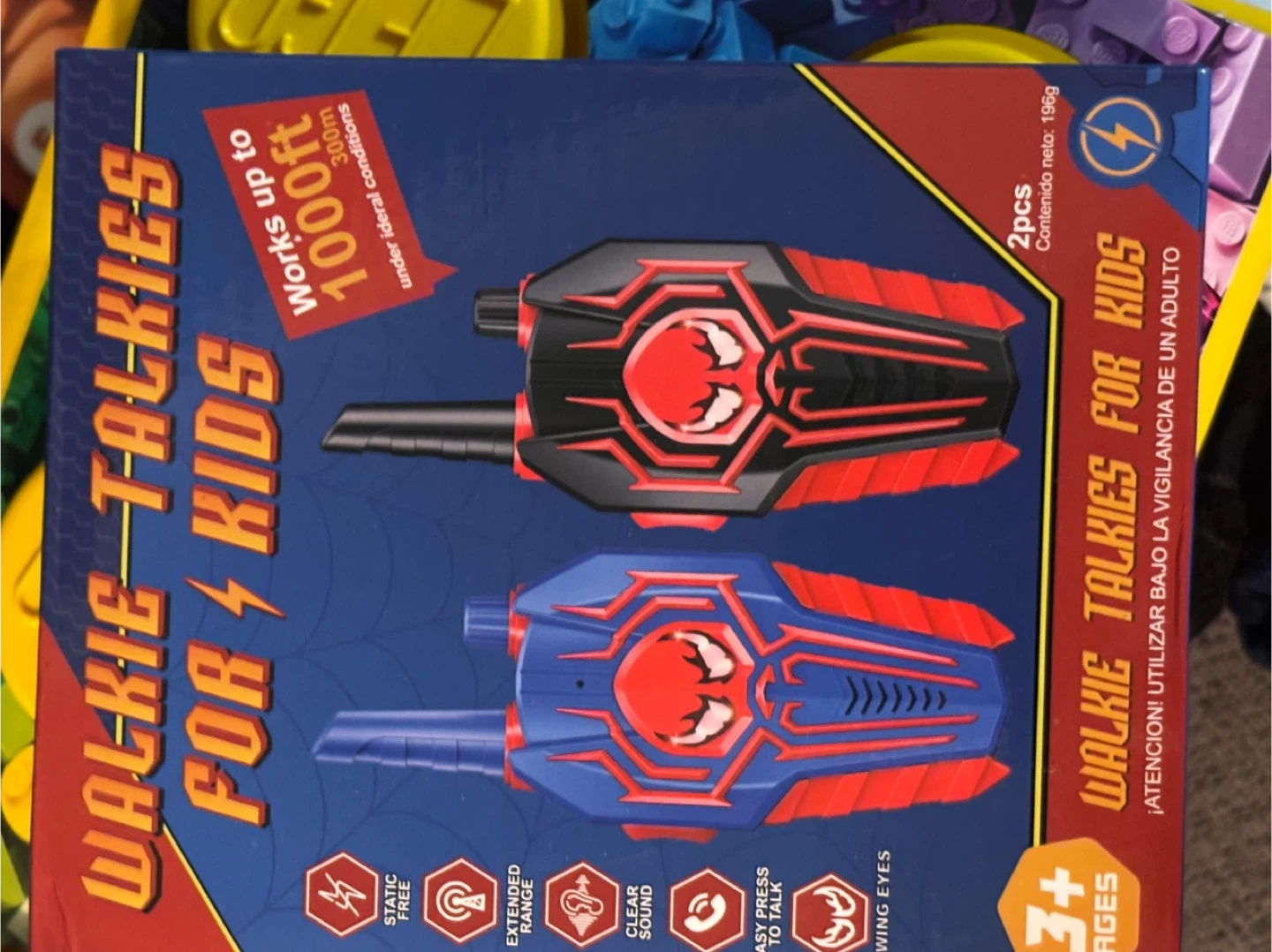 These walkie talkies for kids are perfect for ages 3-8. They are static-free and have extended range. The walkie talkies also have clear sound and easy-press to talk buttons. They even have glowing eyes! The box says they work up to 1000ft under ideal conditions
