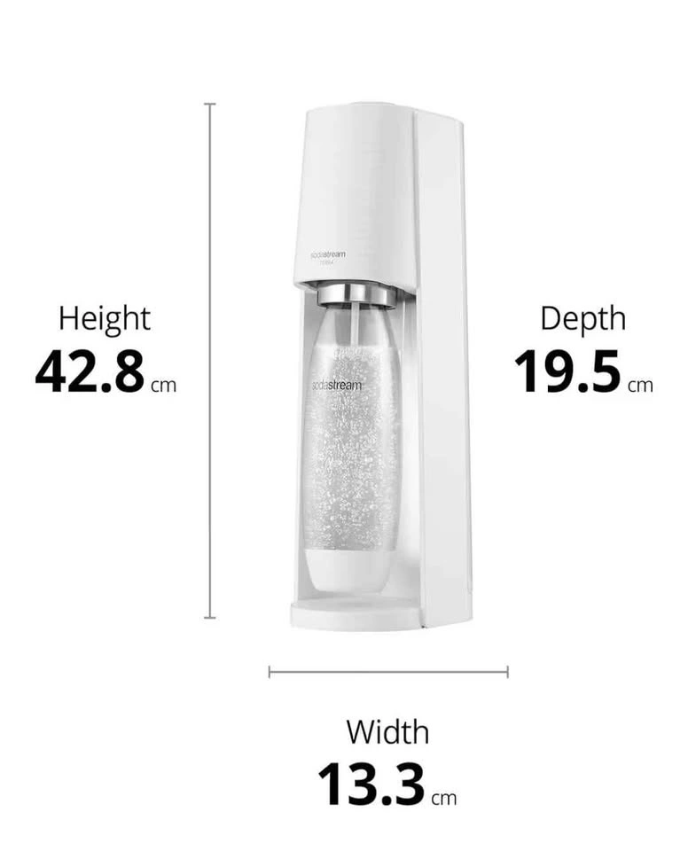 Sparkling water at your fingertips! This SodaStream Terra is perfect for making your own bubbly drinks at home. It's in great condition and easy to use. The dimensions are: Height 42.8 cm, Depth 19.5 cm, and Width 13.3 cm