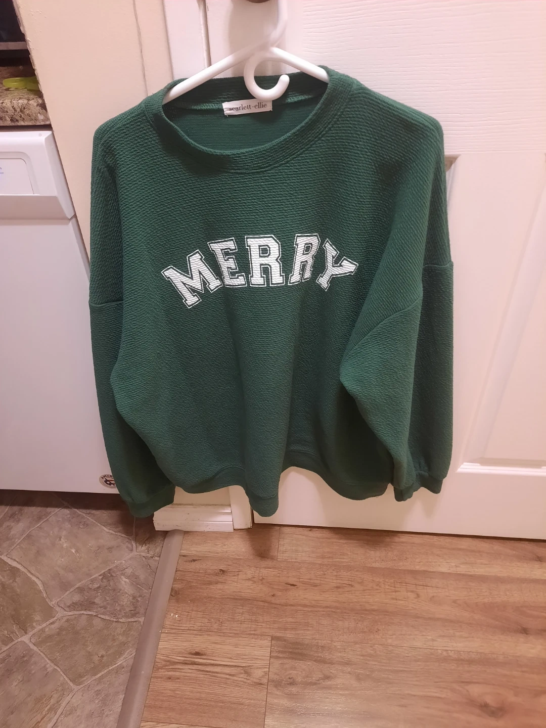 Description: It is a soft, green knit pullover featuring a bold white "MERRY" stencil graphic on the front.