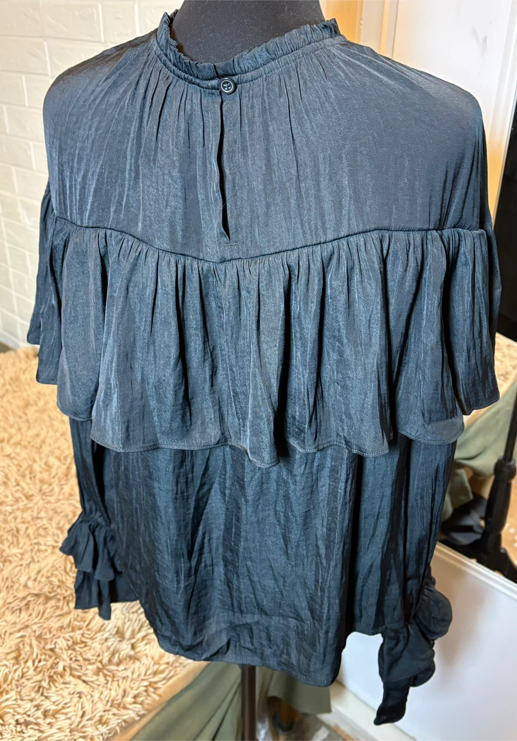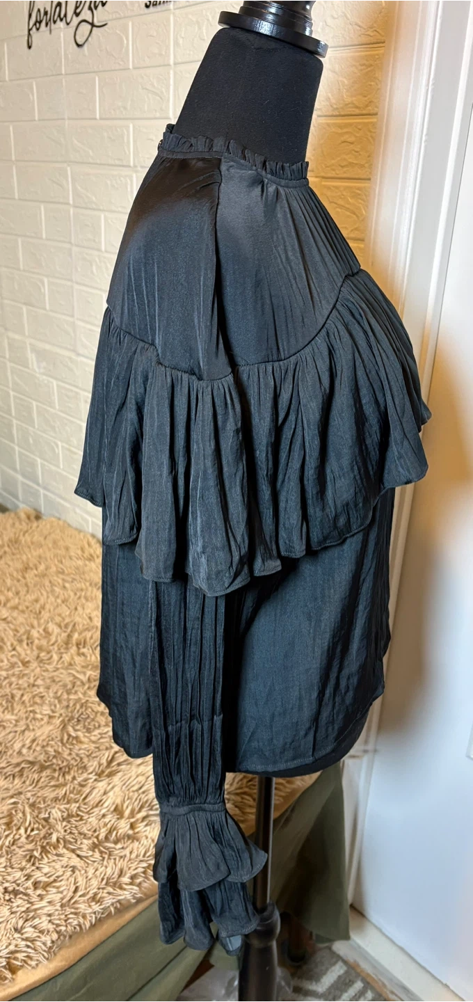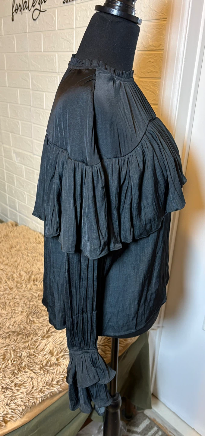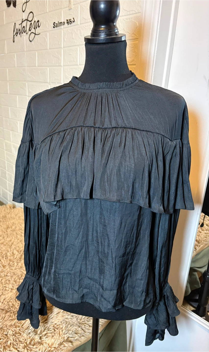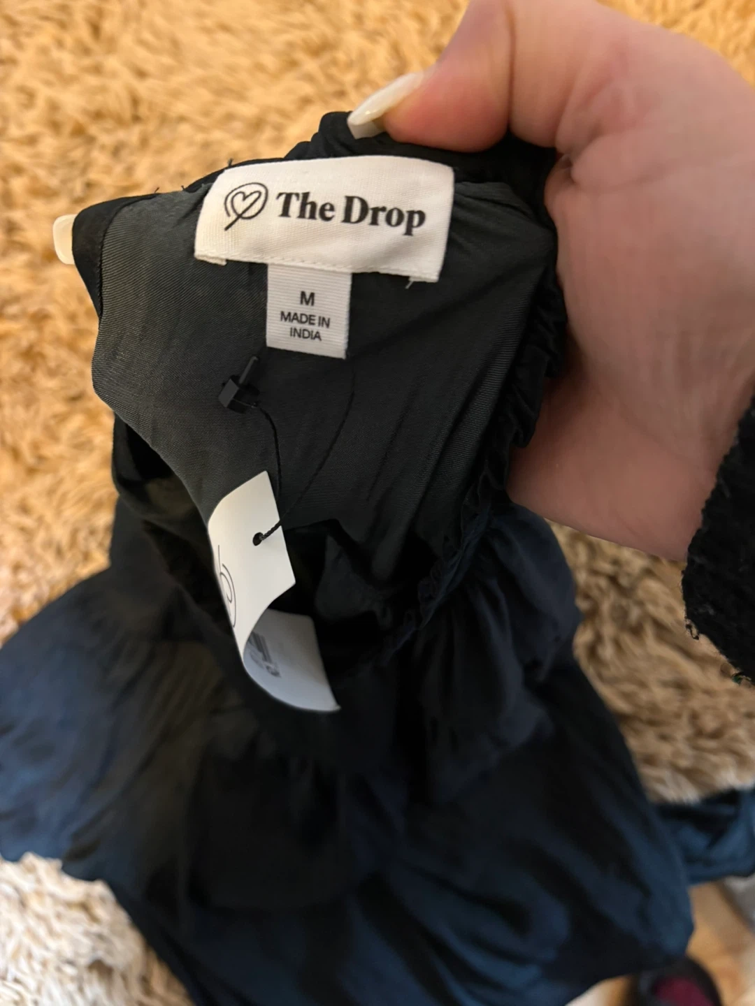 Selling a stylish black ruffle blouse from The Drop. This blouse is a size M and features a unique layered ruffle design. ready to add a touch of elegance to your wardrobe!