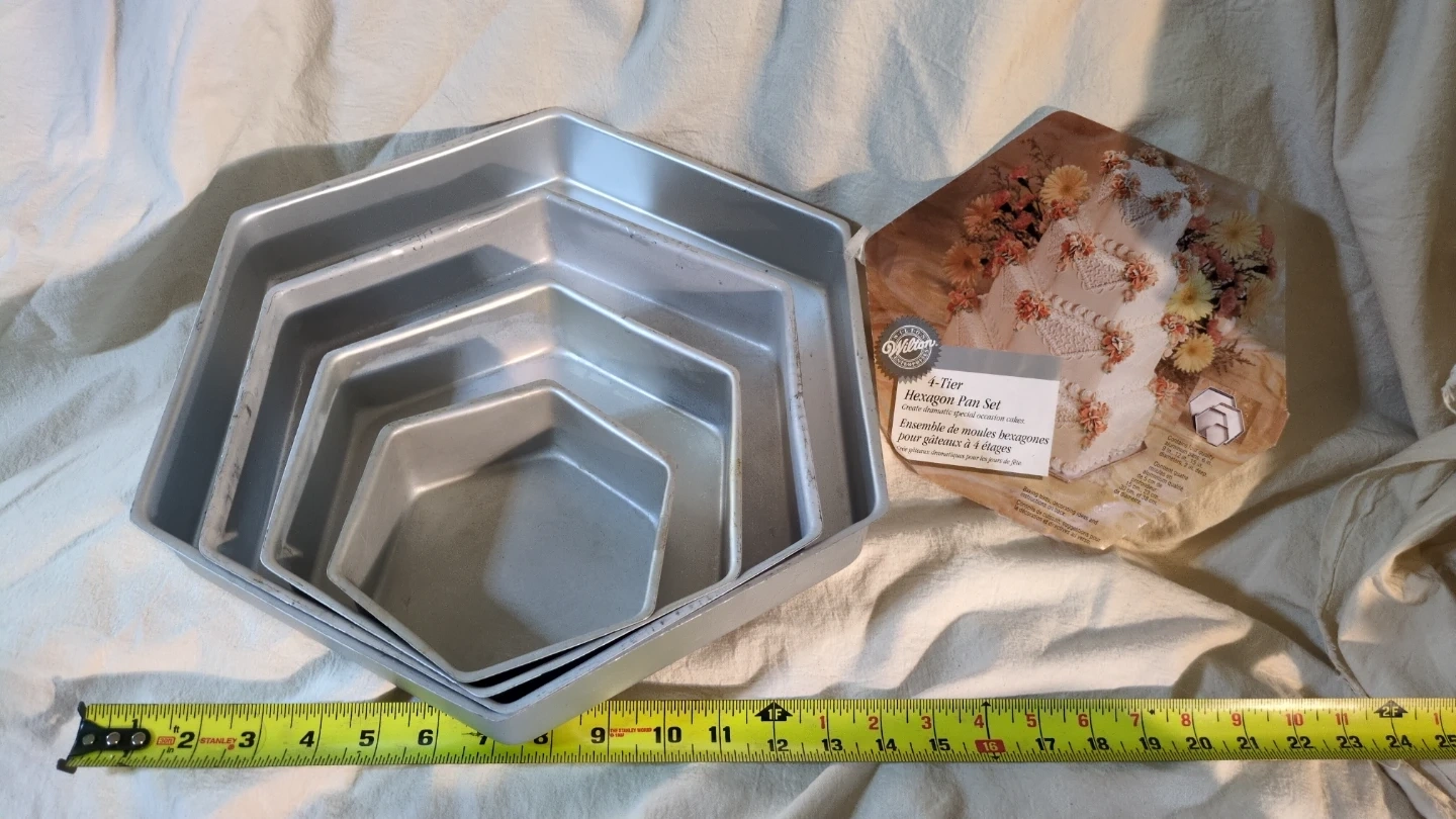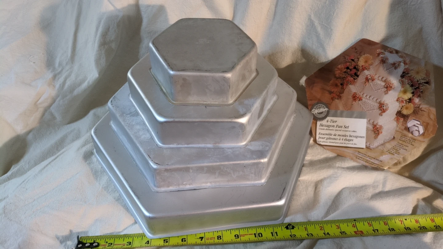 Selling a Wilton 4-Tier Hexagon Pan Set for creating dramatic special occasion cakes! It's a set of four hexagon-shaped pans in varying sizes to create a tiered cake.