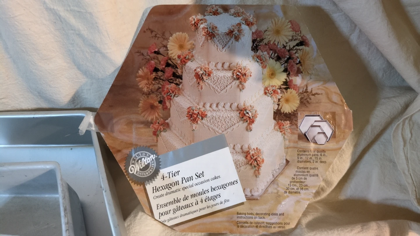 Selling a Wilton 4-Tier Hexagon Pan Set for creating dramatic special occasion cakes! It's a set of four hexagon-shaped pans in varying sizes to create a tiered cake.