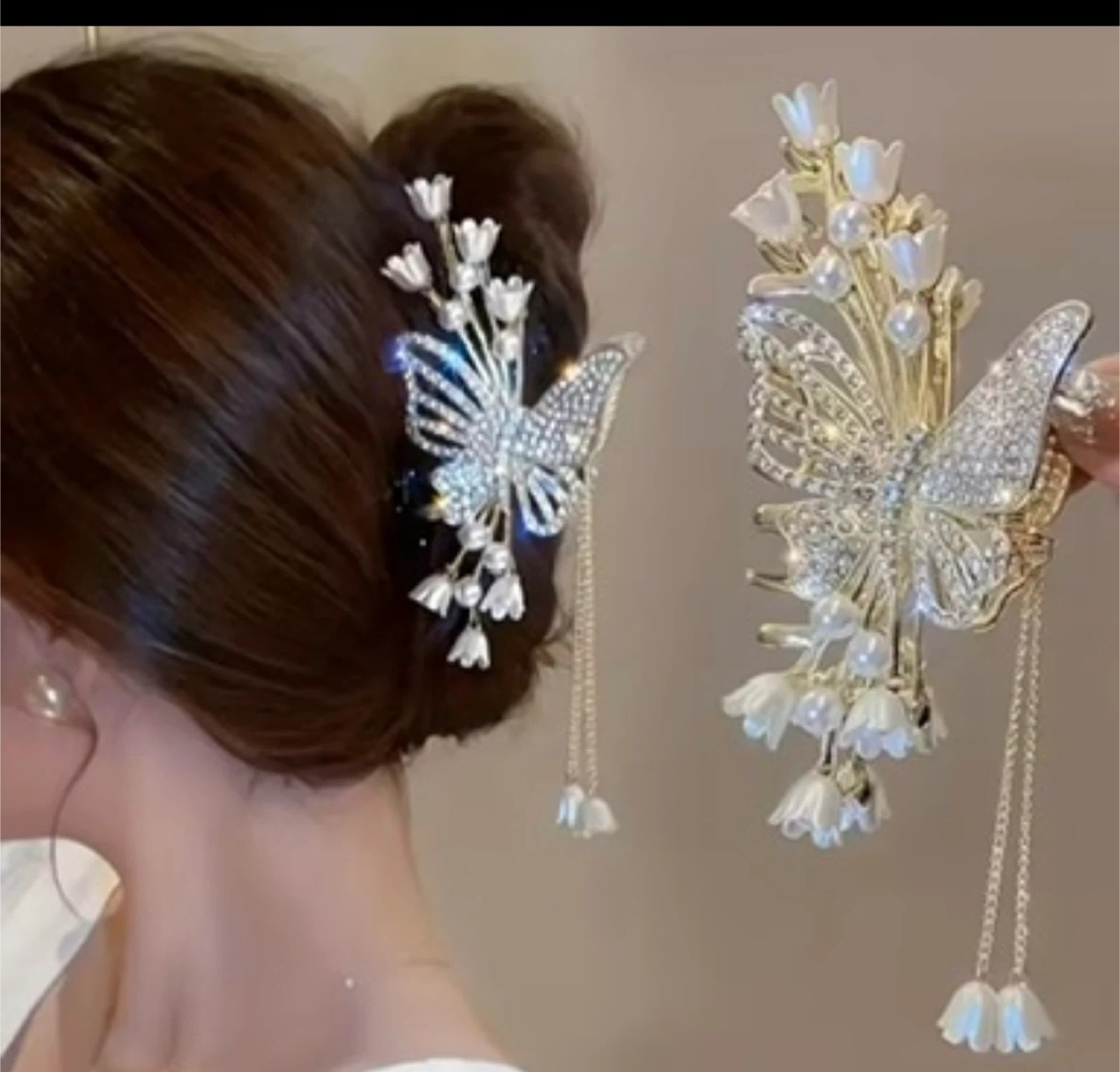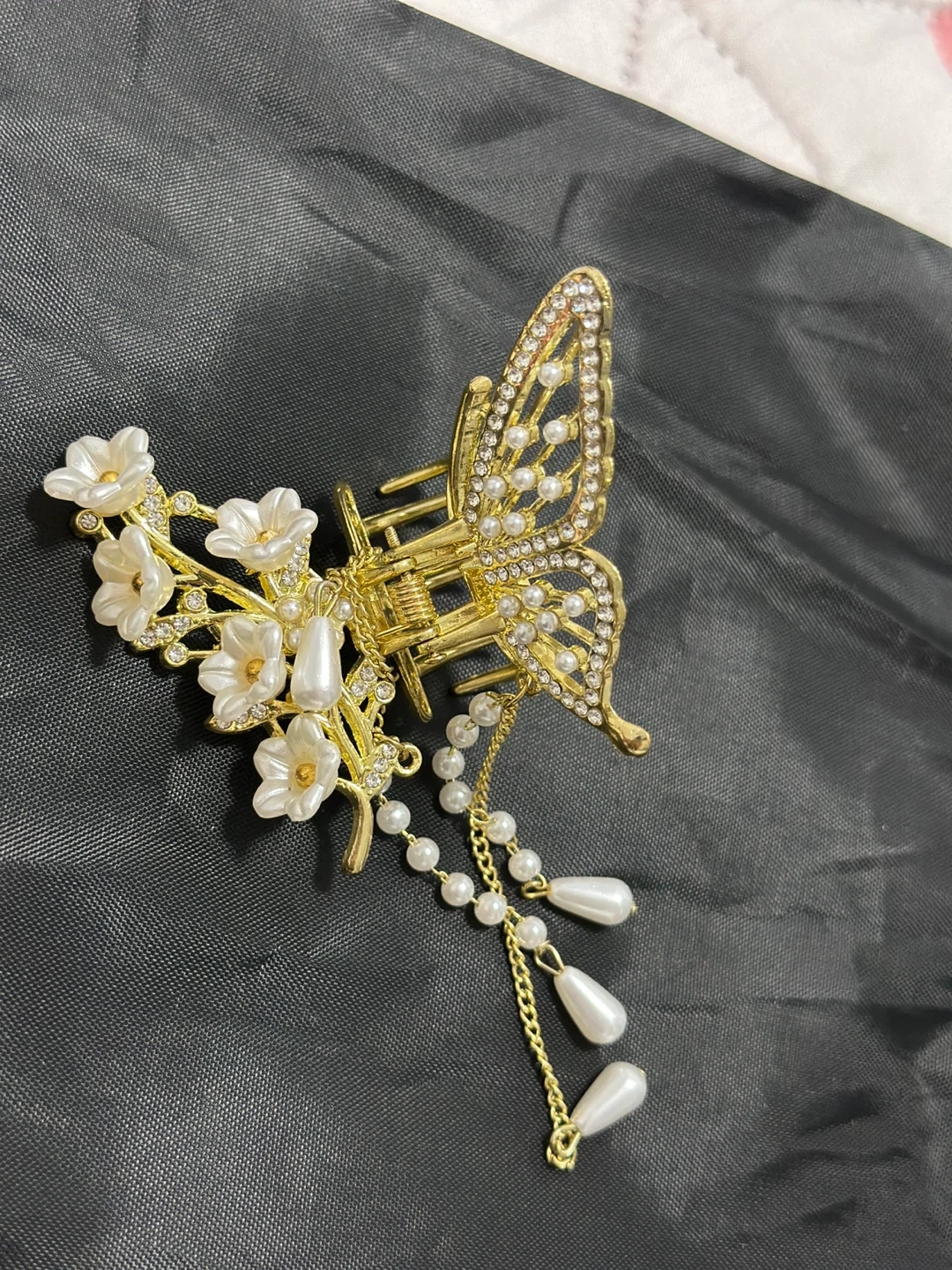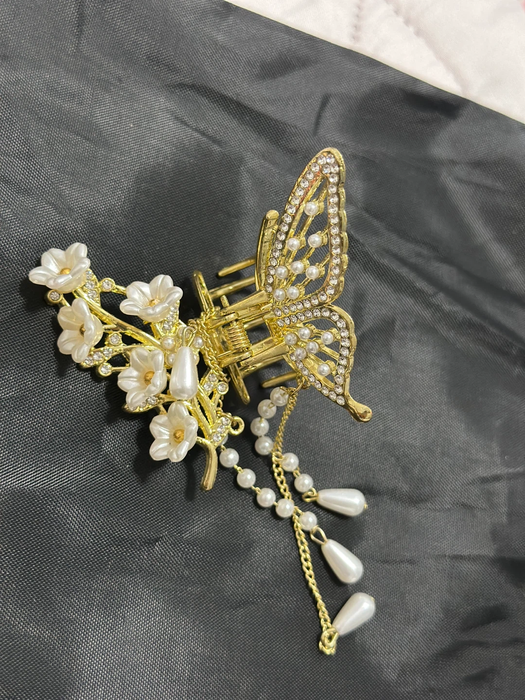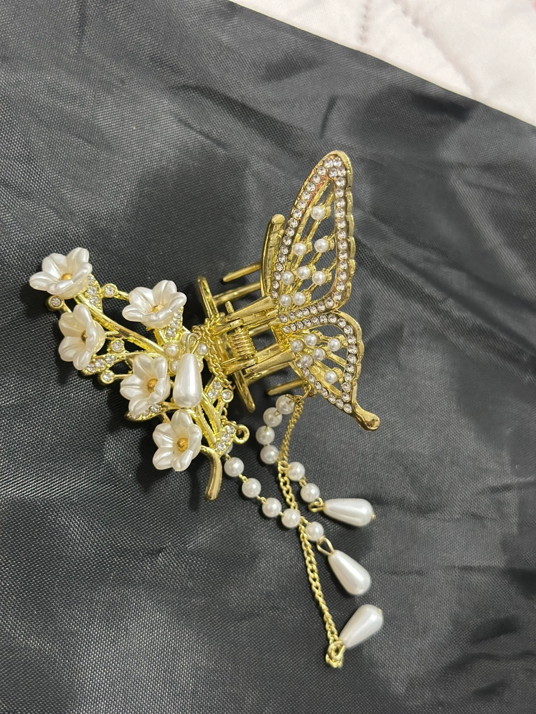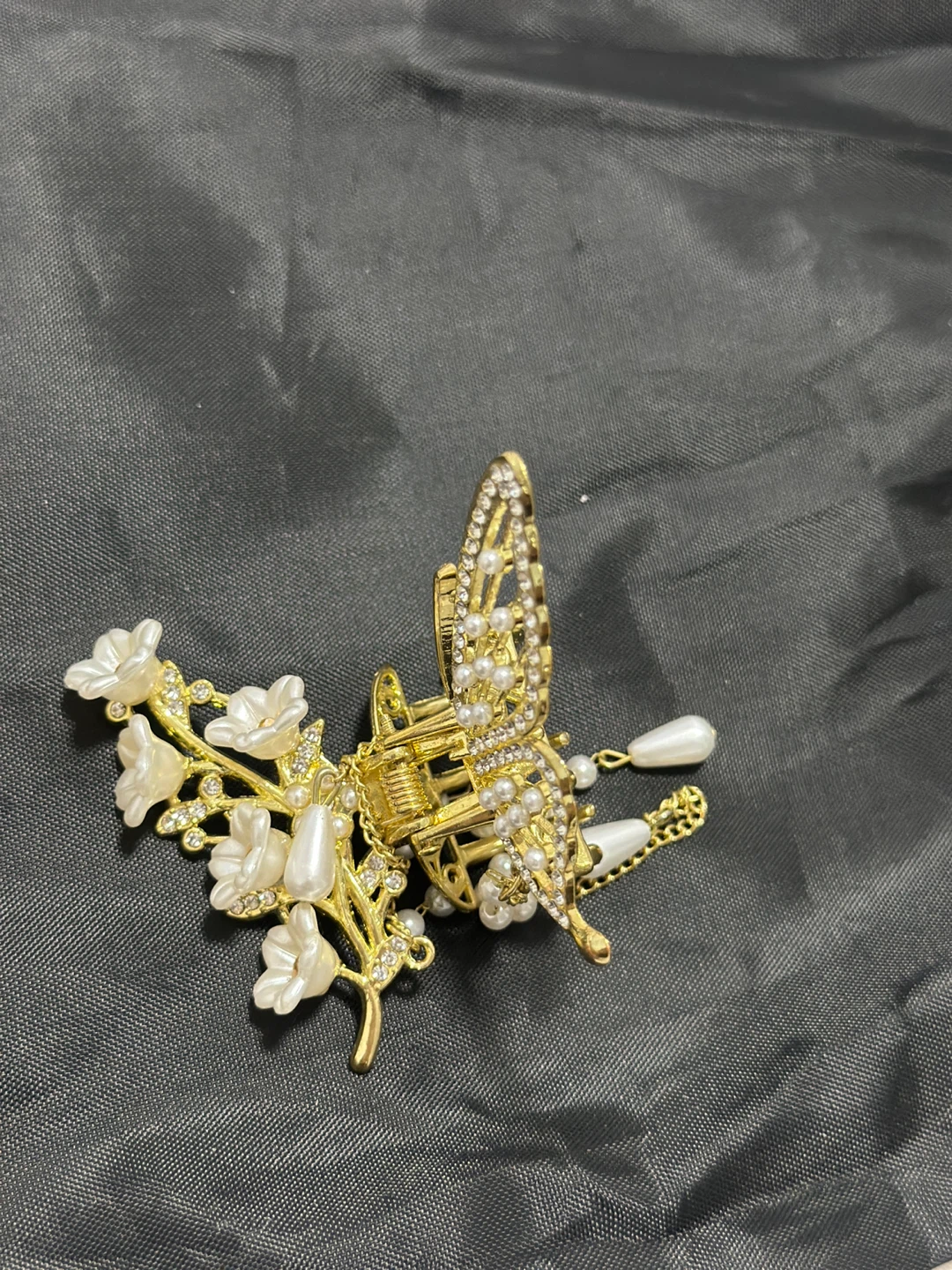 Selling a lovely gold-tone hair claw clip featuring a butterfly and floral design. It's adorned with faux pearls and rhinestones, adding a touch of elegance to any hairstyle!