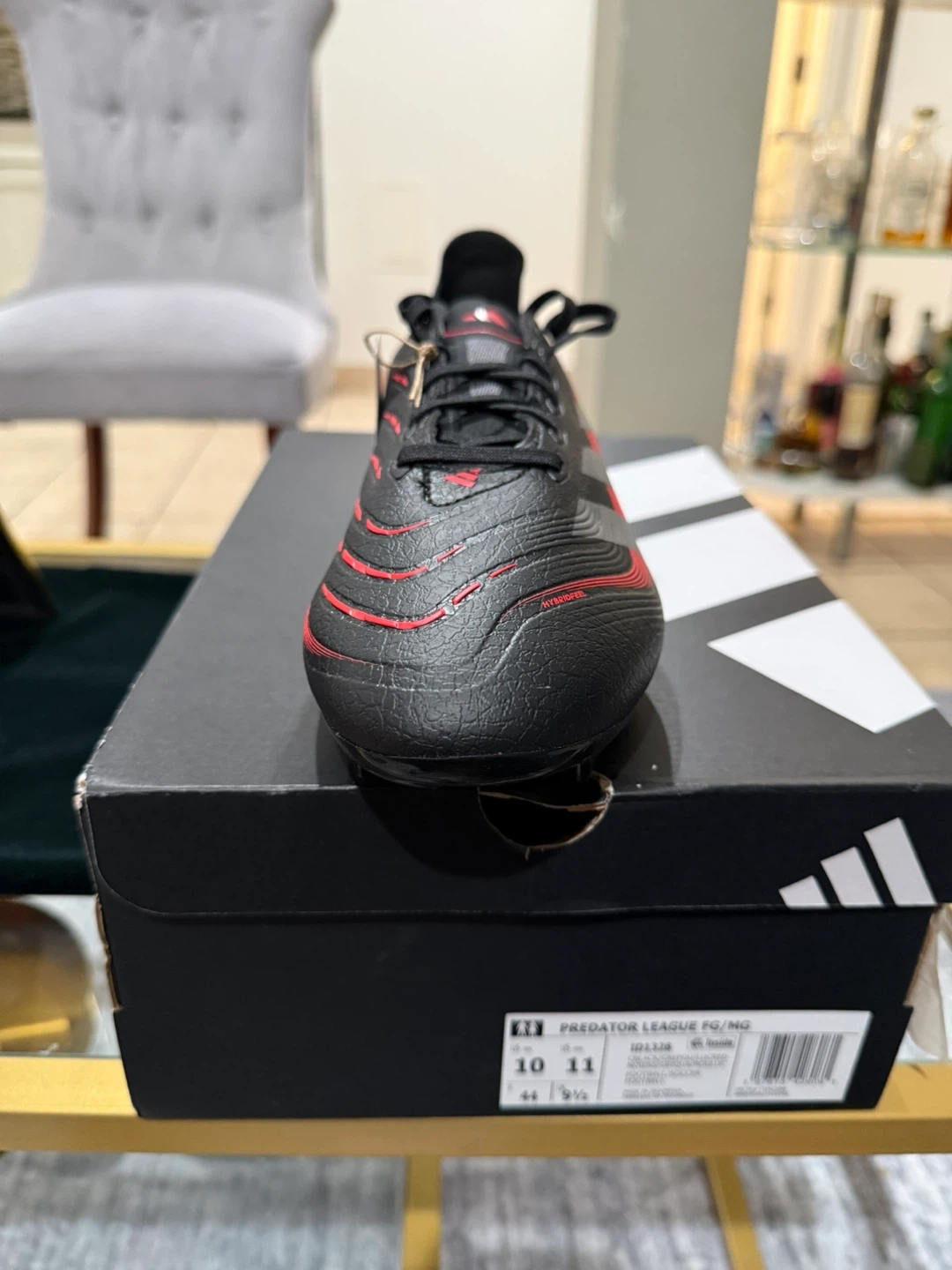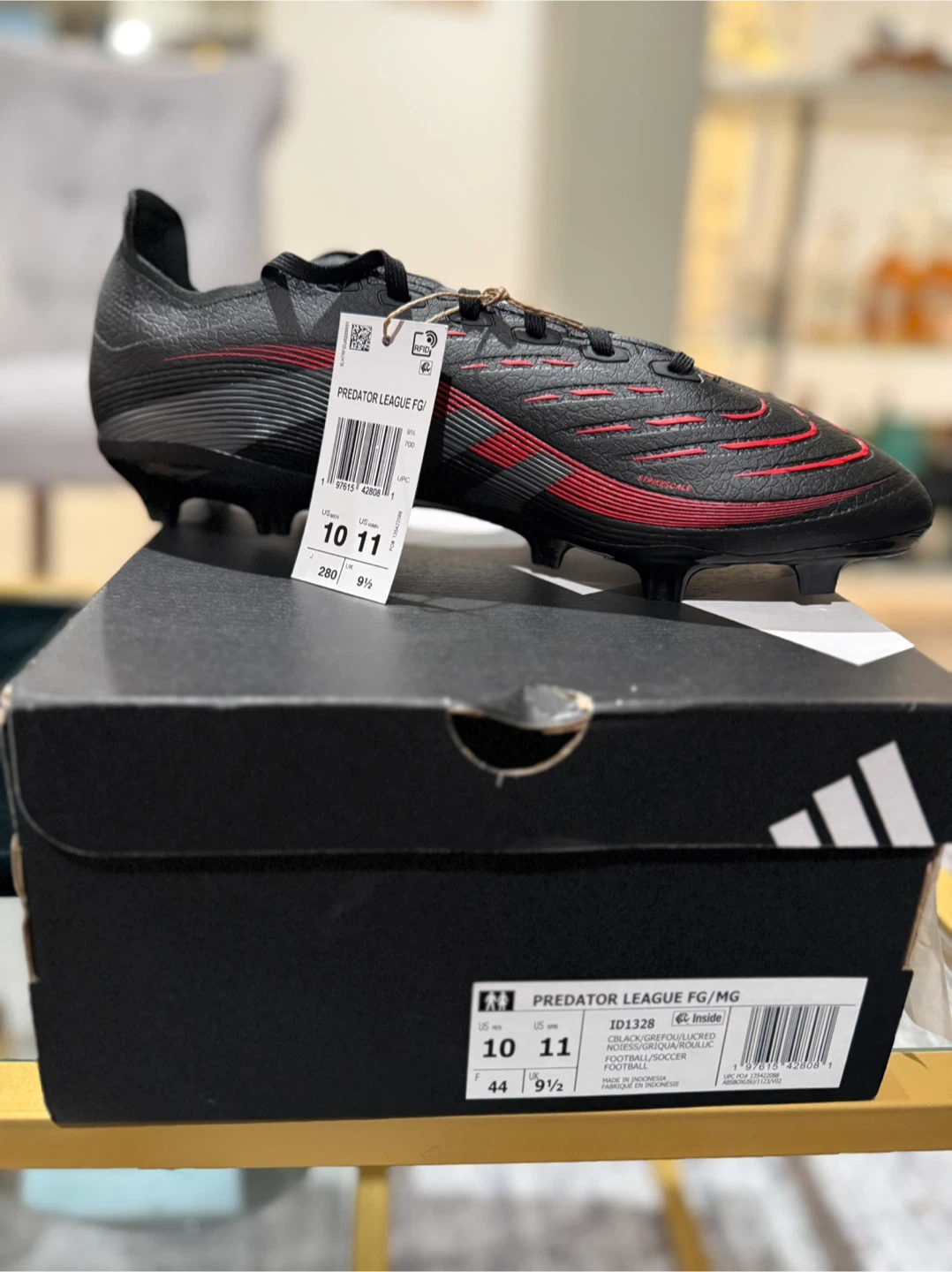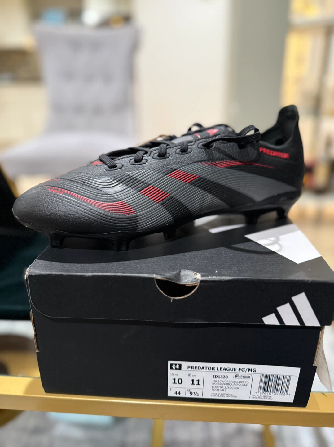 Get ready to dominate the field with these Adidas Predator League FG/MG soccer cleats! They come in a sleek black color with red accents. These cleats are a US size 10, UK size 10, and EU size 44. The box is included!