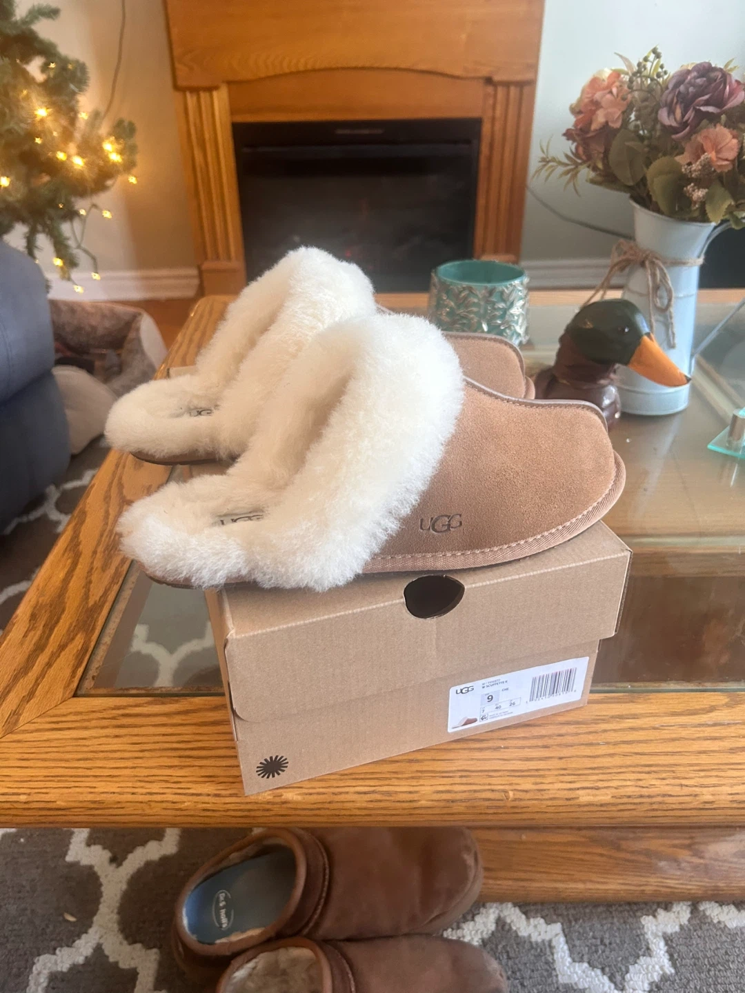 UGG Scuffette II slippers in a women's size 9! These slippers are in good condition and come with the original box. They're perfect for keeping your feet warm and cozy around the house. The slippers have a soft, fluffy lining and a durable sole.