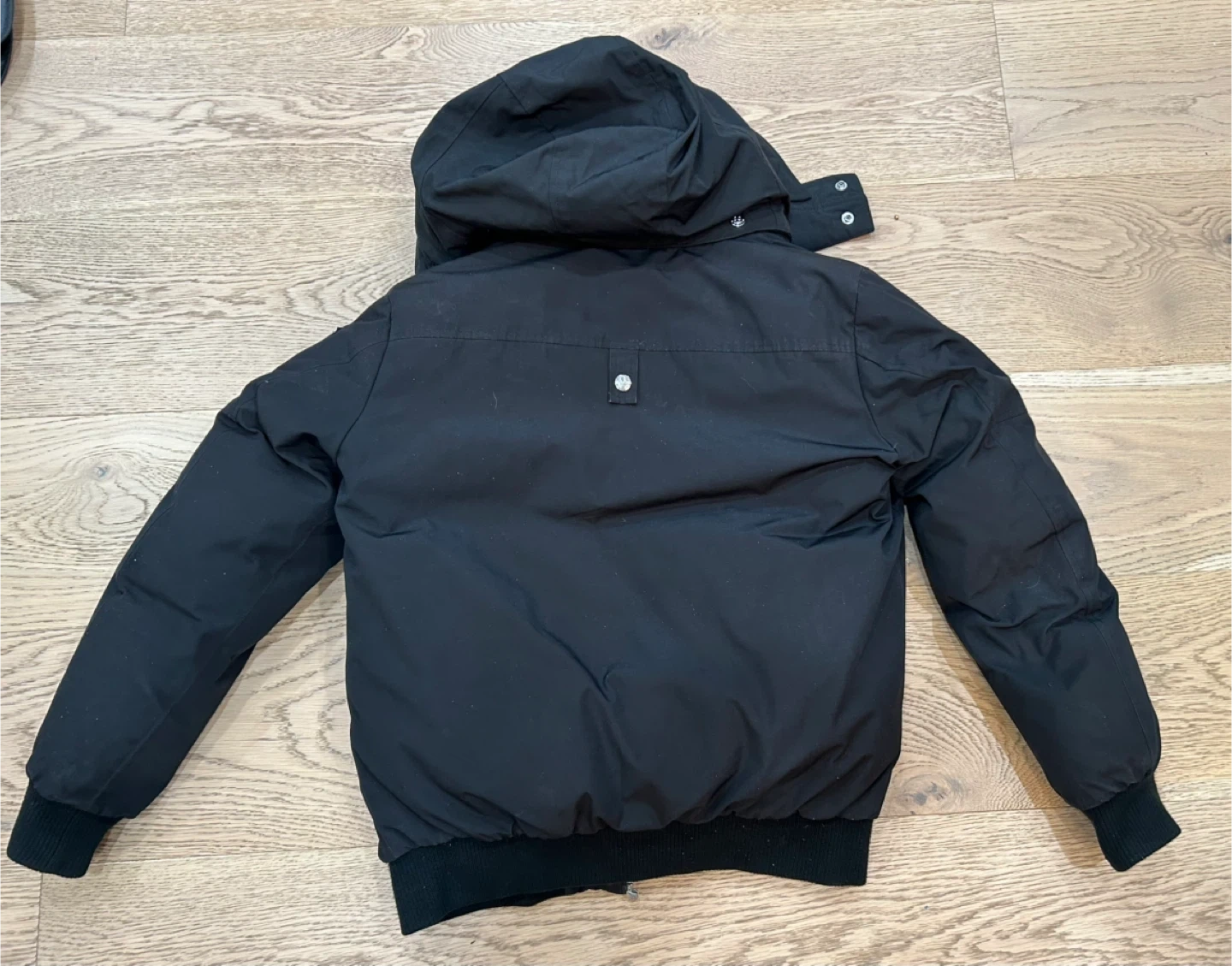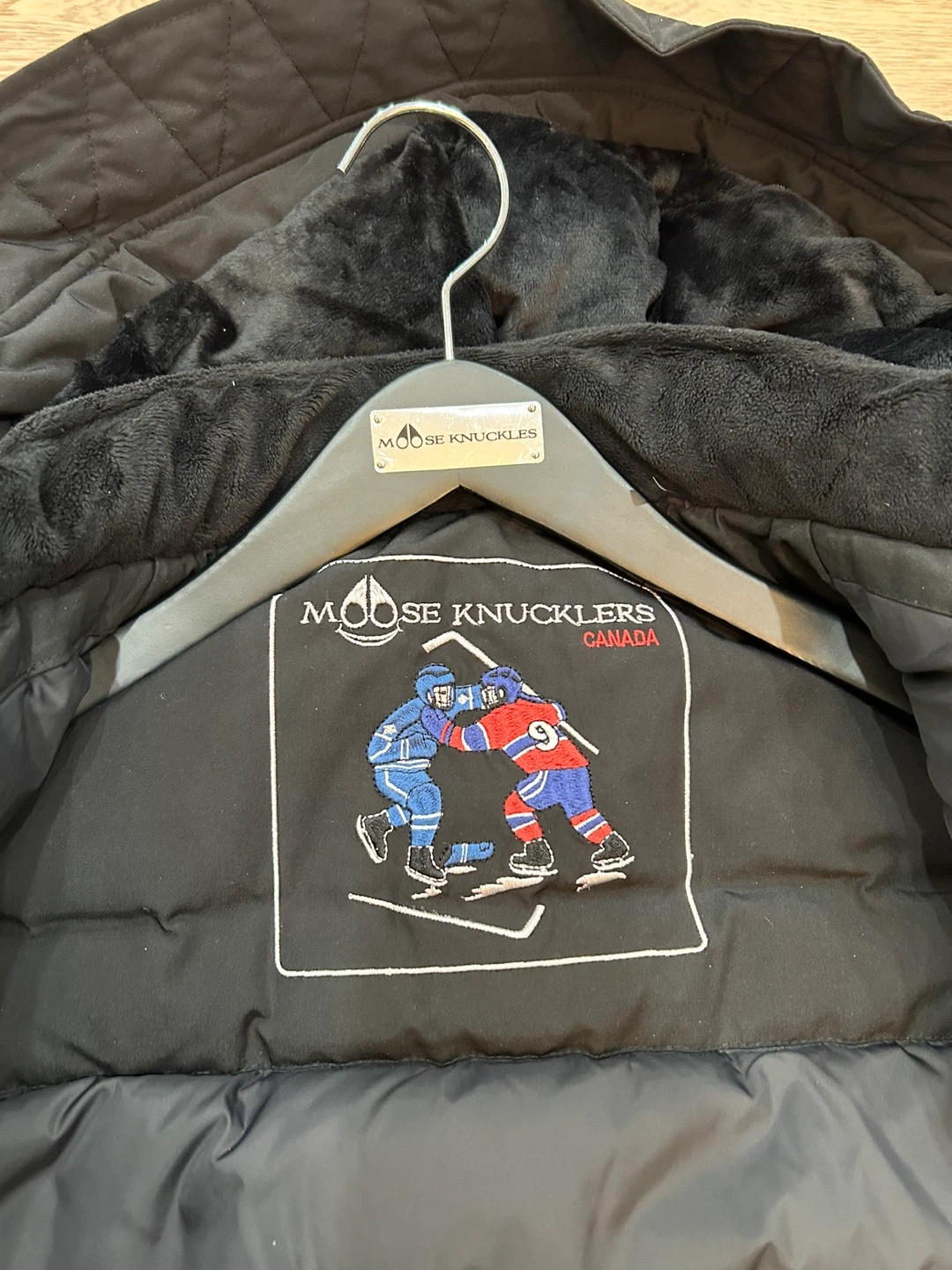 Moose Knuckles bomber jacket in black. It's in great condition and comes with its original garment bag and wooden hangar.