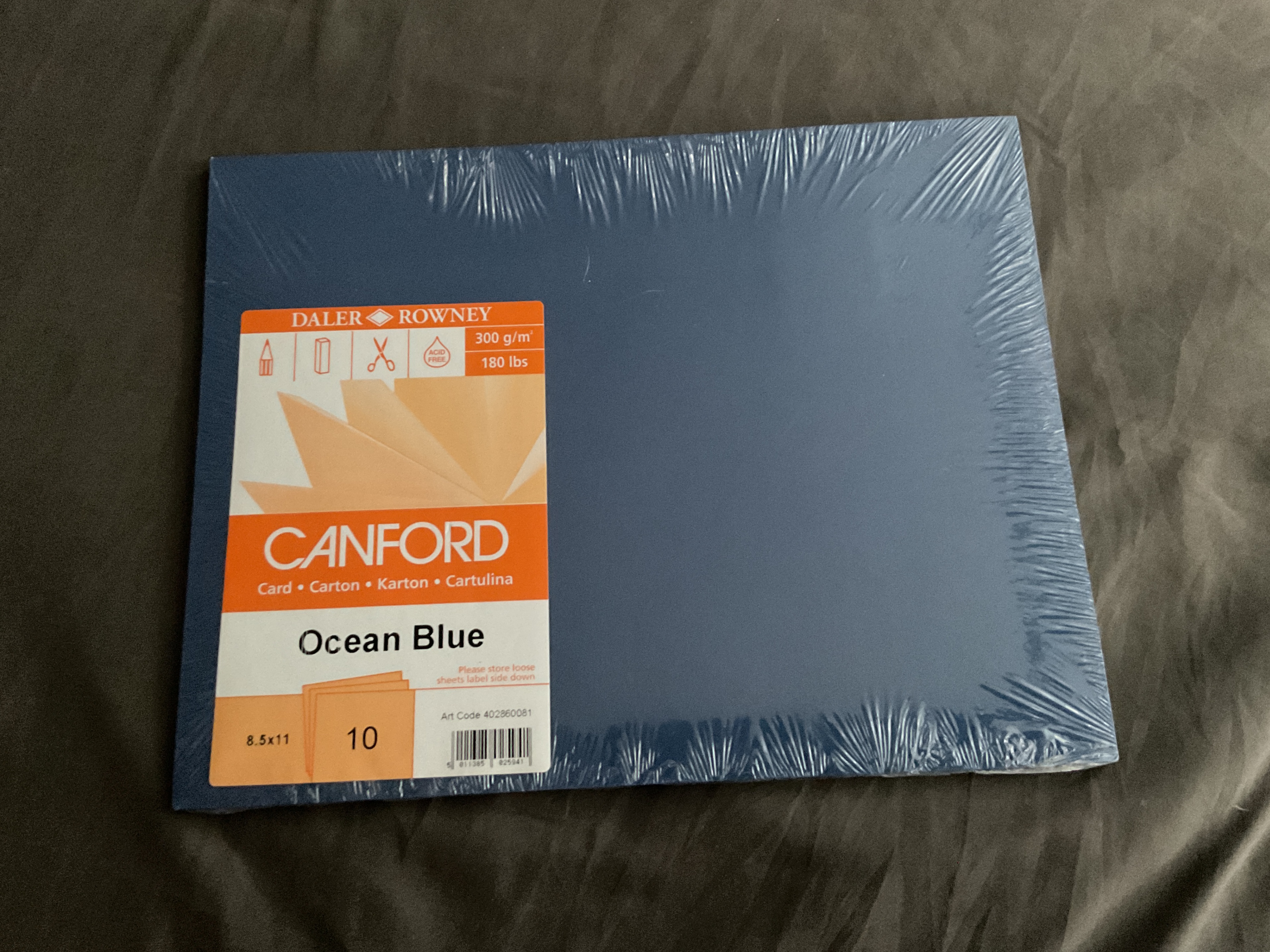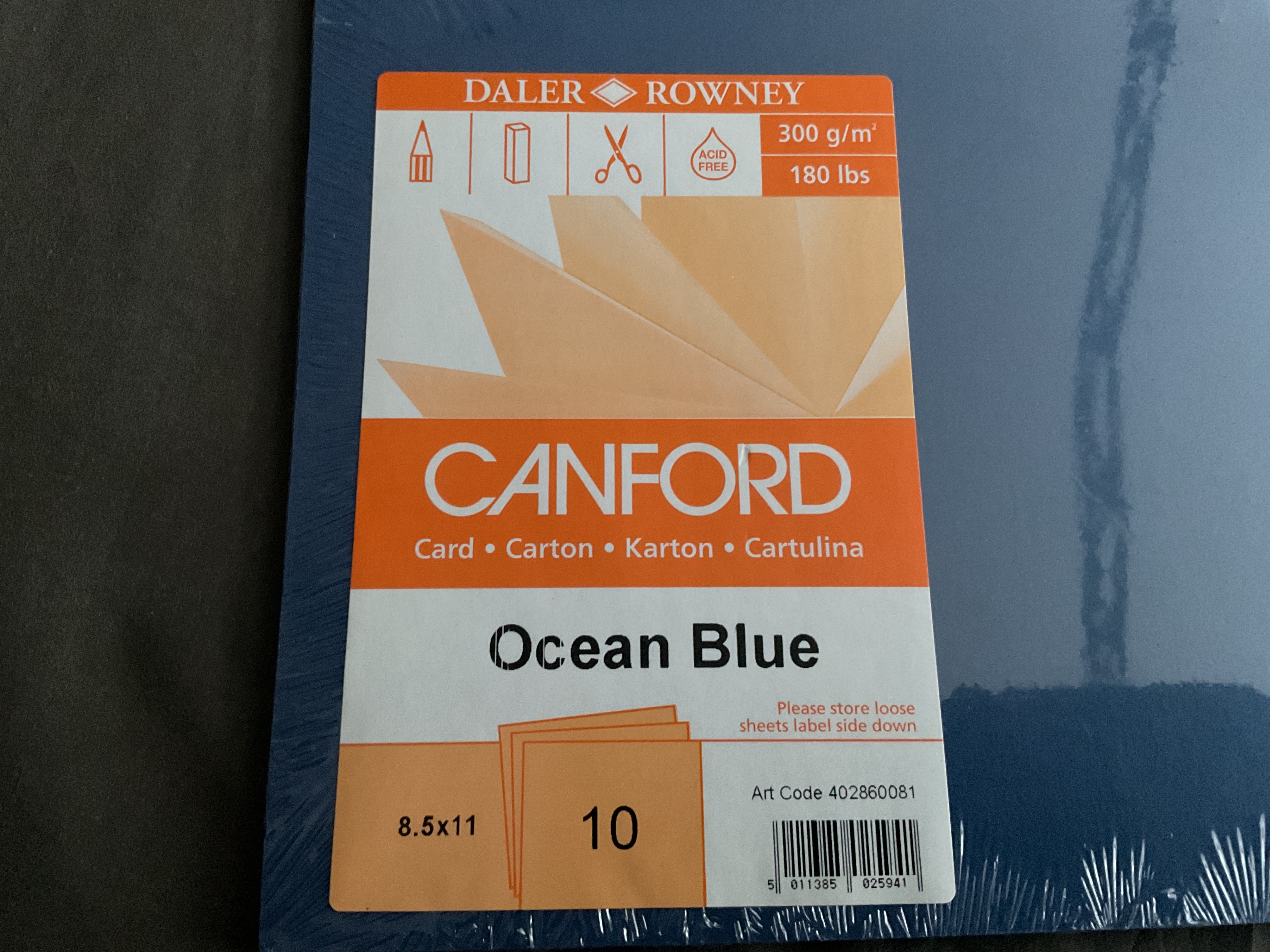 Selling a pack of Daler Rowney Canford cardstock in Ocean Blue. This is a pack of 10 sheets, sized 8.5x11 inches. It's acid-free and weighs 300 g/m² (180 lbs). Great for various crafting and art projects!
