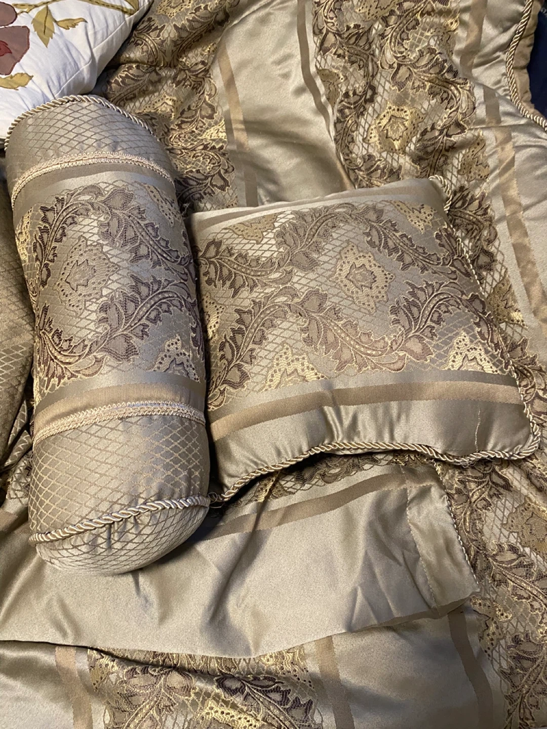 Selling a beautiful decorative bedding set! It includes a decorative pillow, bolster pillow, and a section of the bedding itself. The set features a lovely pattern in shades of gold and brown, perfect for adding a touch of elegance to any bedroom