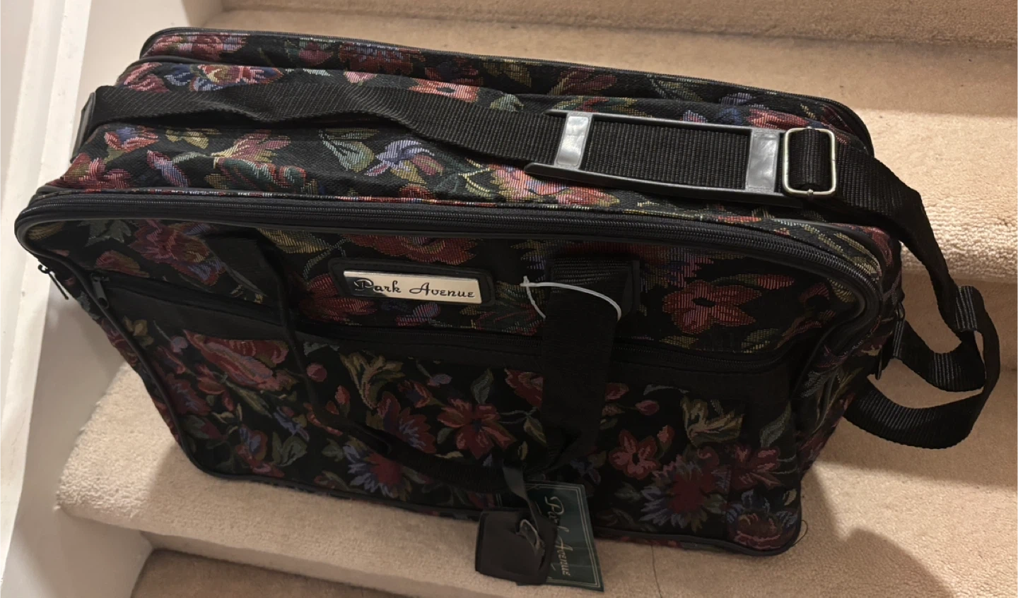 Park Avenue carry-on bag with a lovely floral tapestry design! It features a convenient shoulder strap and a spacious interior, and side opening with straps to secure your belongings. Perfect for your next trip.