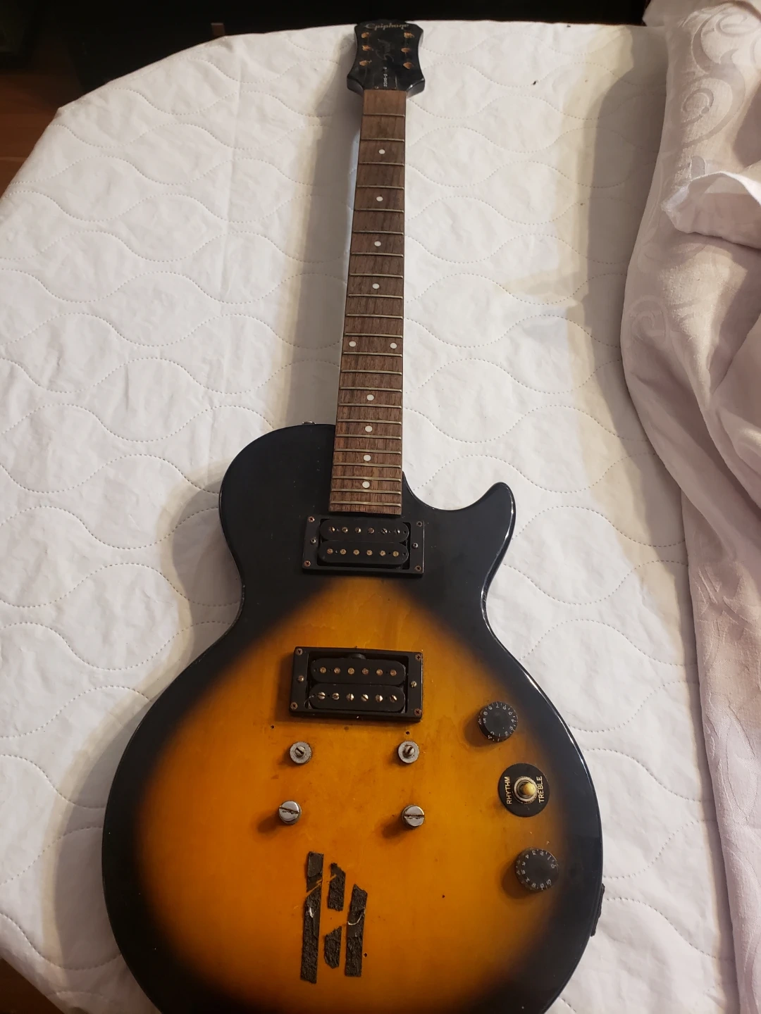 Selling an Epiphone Special Model electric guitar. It has a black and orange sunburst finish. There are some signs of wear and tear, but it's still a great instrument for someone looking to rock out!