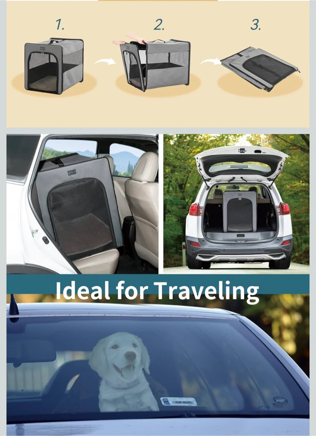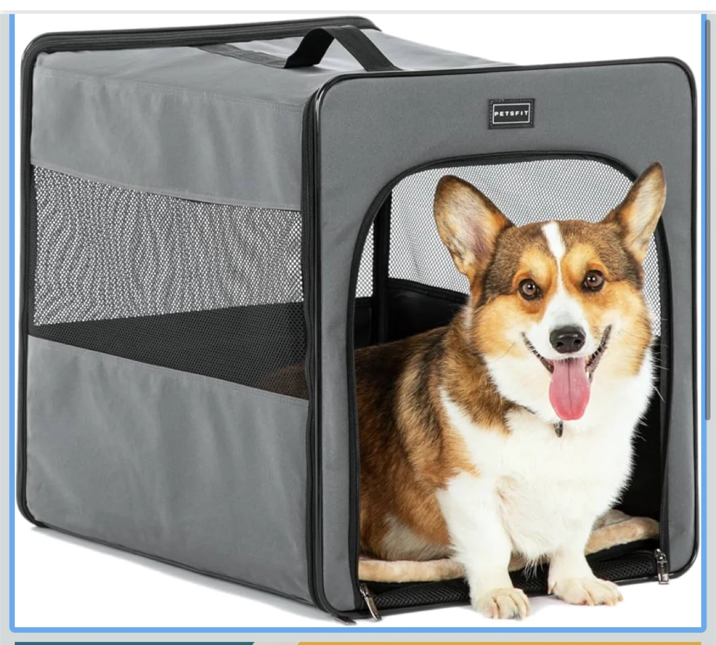 This is a PETSFIT portable pet carrier crate, perfect for traveling with your furry friend! It's gray and measures approximately 21" x 24" x 18". The crate is designed for easy folding and storage, making it ideal for car rides and trips. It features mesh windows for ventilation and visibility, ensuring your pet stays comfortable and secure.