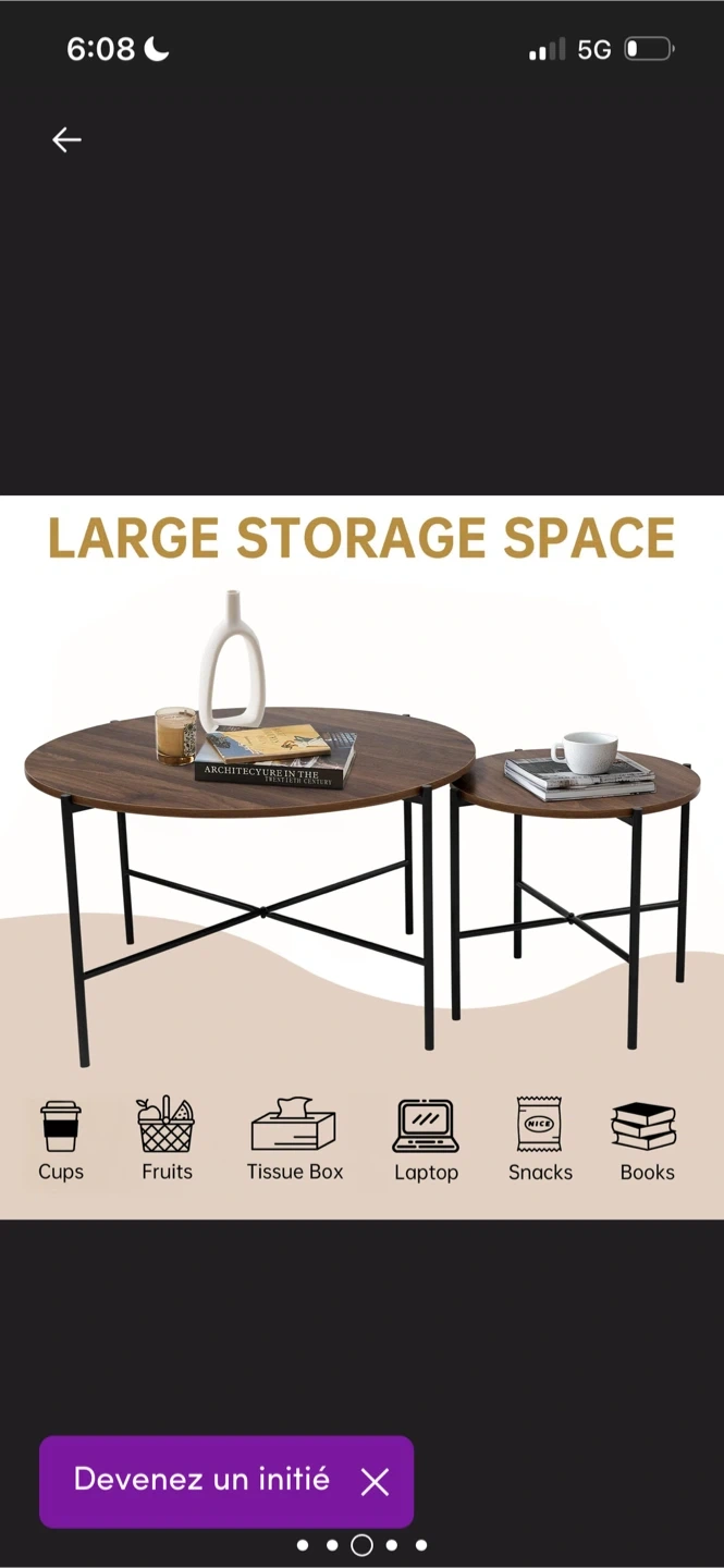 Selling a set of nesting coffee tables! The set includes two round tables with a wood-like top and black metal legs. The larger table is about 31.5 inches in diameter and 16.5 inches tall, while the smaller one is approximately 17.7 inches in diameter and 16.9 inches tall. Easy to clean and looks great!