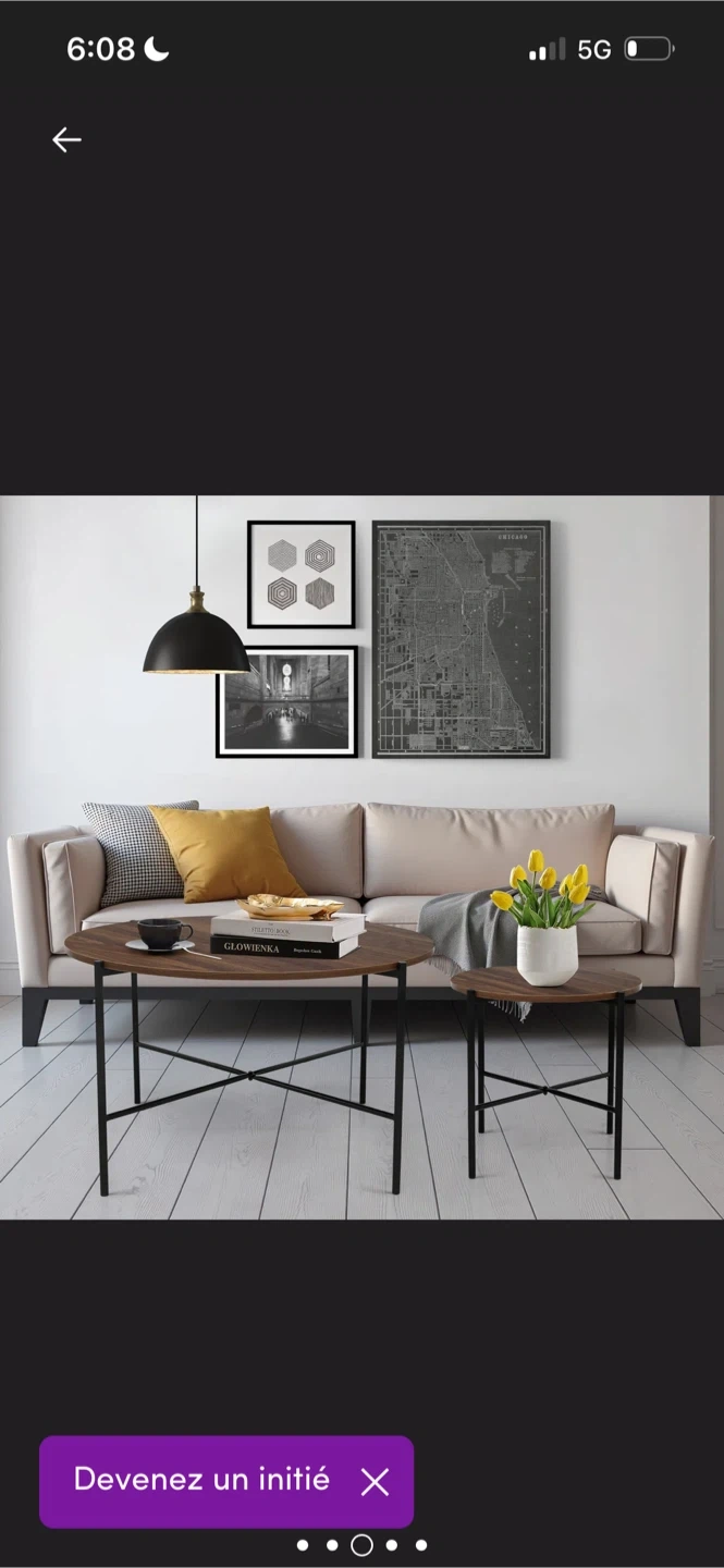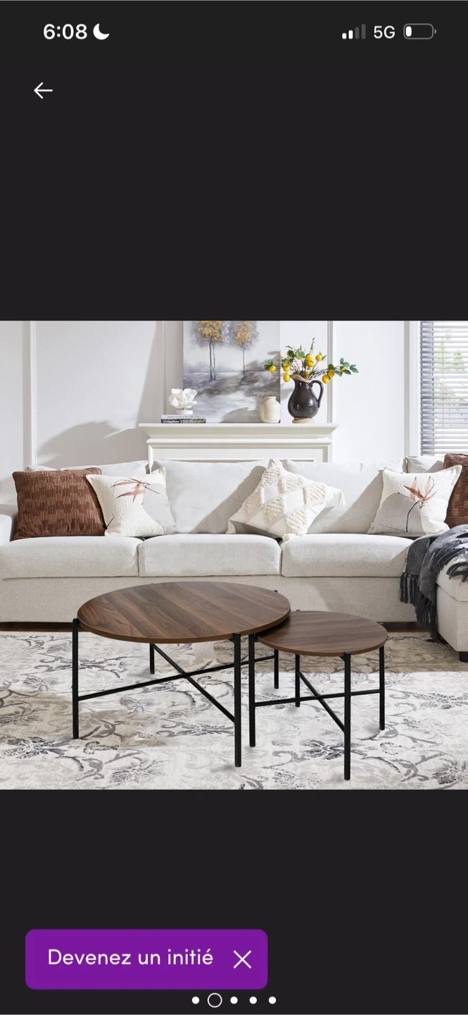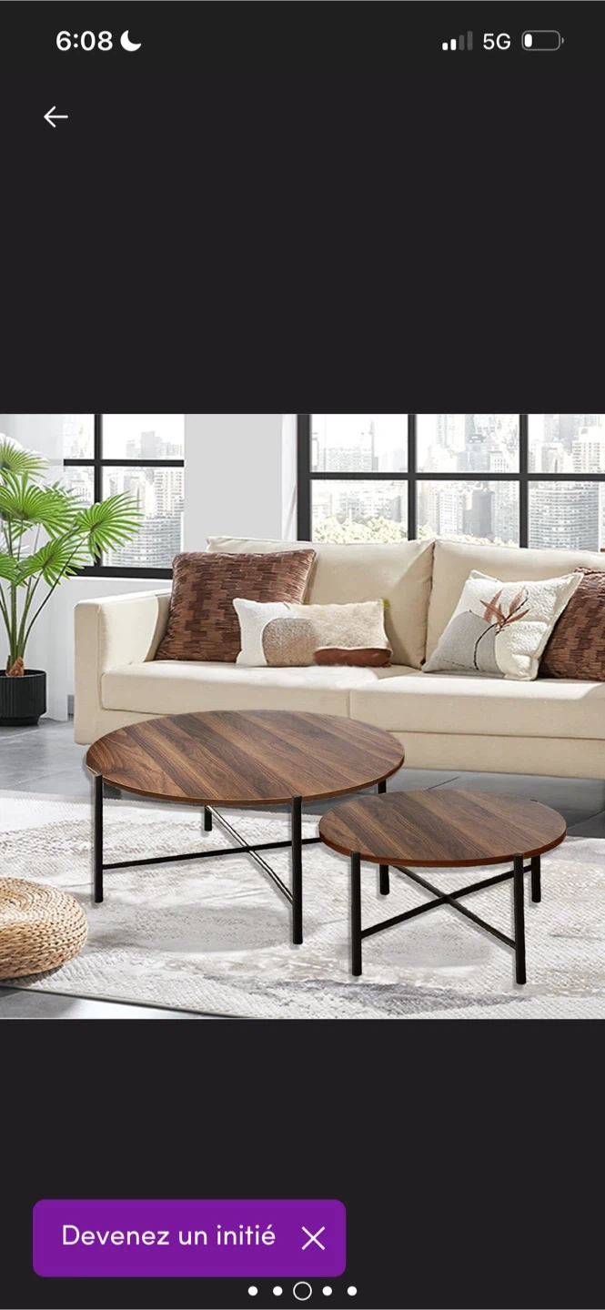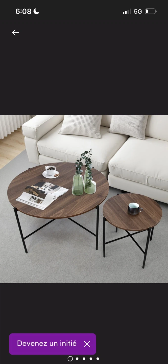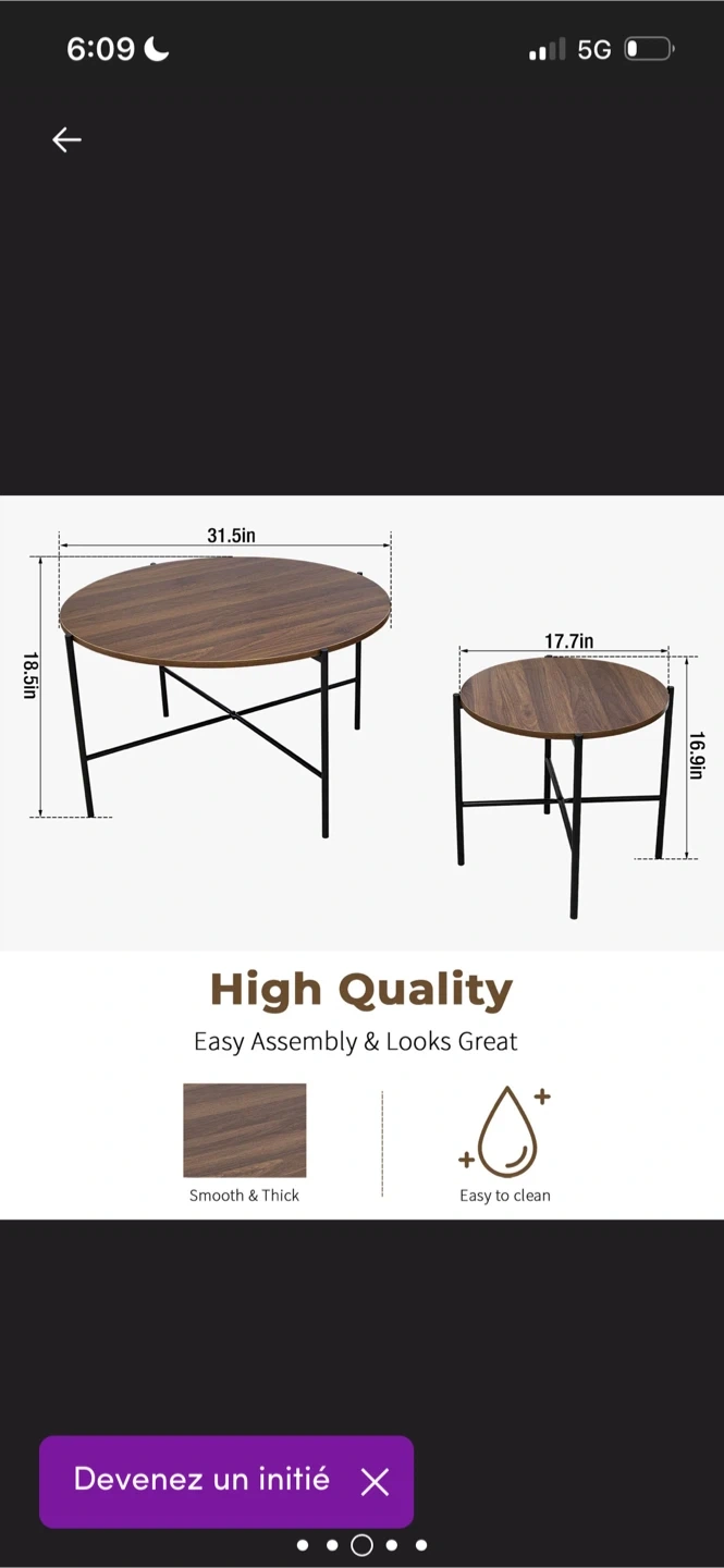 Selling a set of nesting coffee tables! The set includes two round tables with a wood-like top and black metal legs. The larger table is about 31.5 inches in diameter and 16.5 inches tall, while the smaller one is approximately 17.7 inches in diameter and 16.9 inches tall. Easy to clean and looks great!