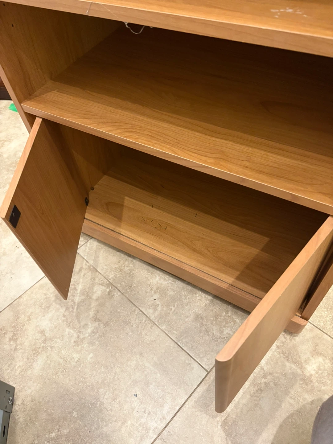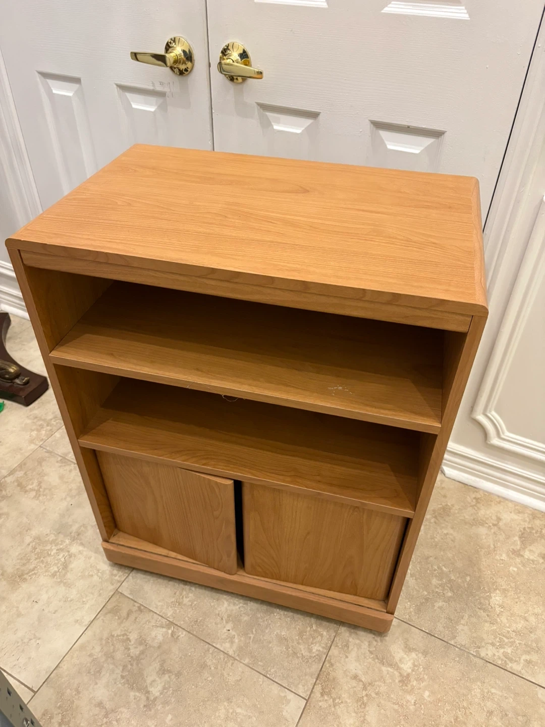 Selling a wooden TV stand that also works great as a storage cabinet! It features shelves and a cabinet area with doors, perfect for organizing your living space or entertainment area. It's in good condition and ready for a new home!