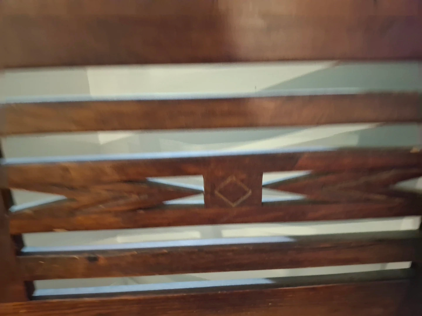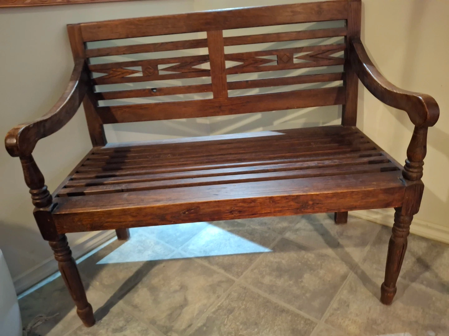 Selling a two-seater solid wood bench. It has a beautiful cushion with a unique design along the back. The bench is in great condition and would be a great addition to any home!