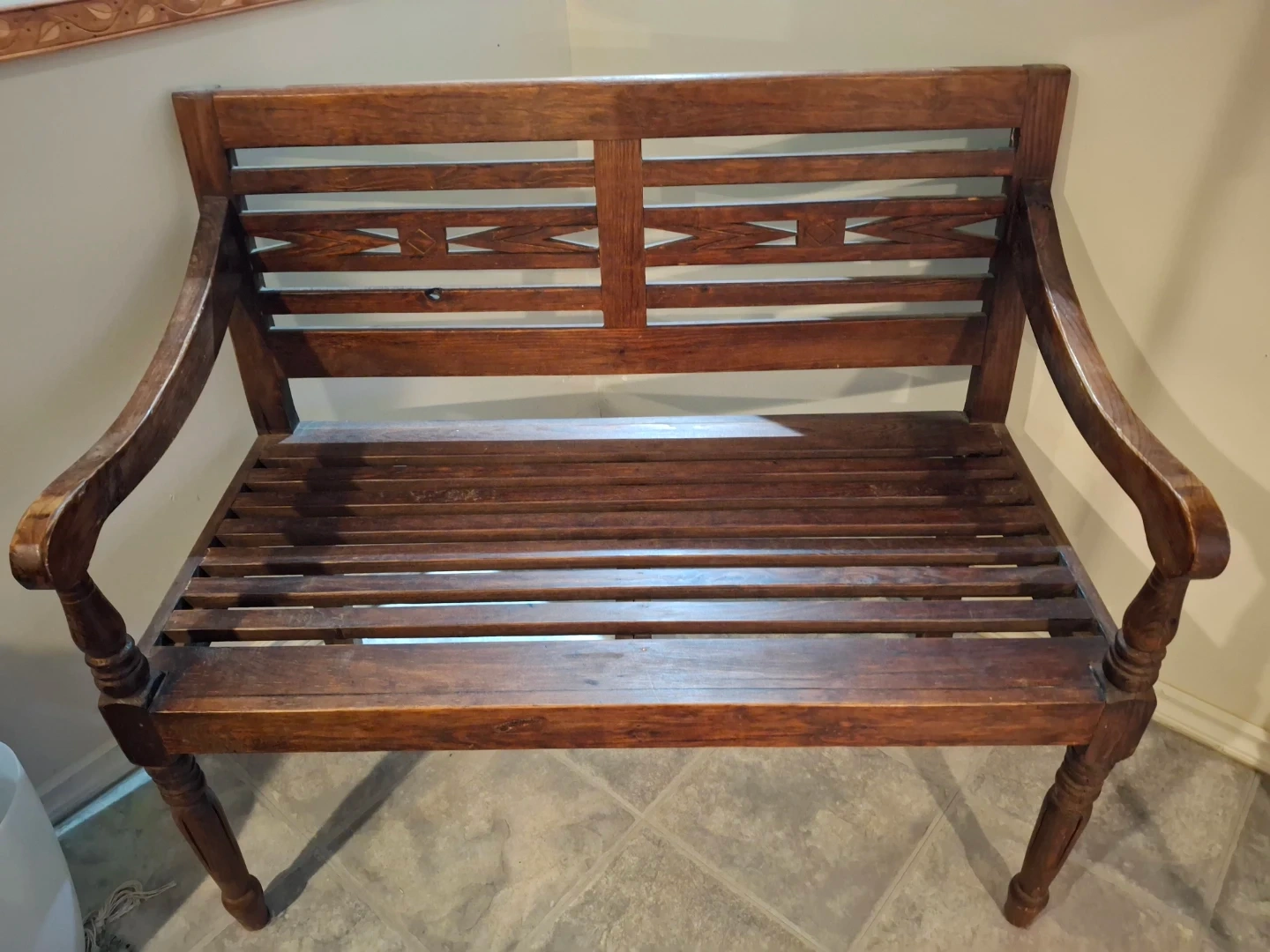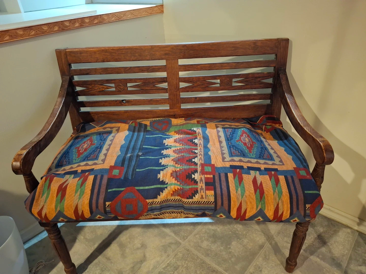 Selling a two-seater solid wood bench. It has a beautiful cushion with a unique design along the back. The bench is in great condition and would be a great addition to any home!