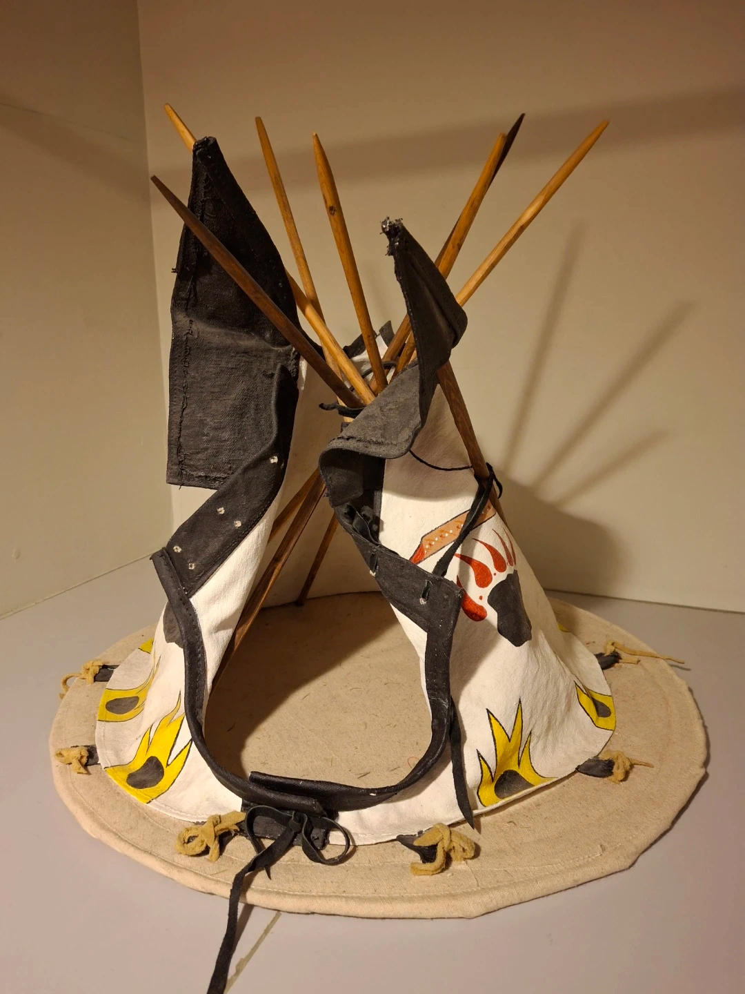 Check out this handmade decorative teepee! It features a unique design with bear paw prints and other eye-catching details. Perfect for adding a touch of whimsy to any room or for imaginative play. I have used it to store my smudge. It sits on a base 21.5" wide & 21" high.