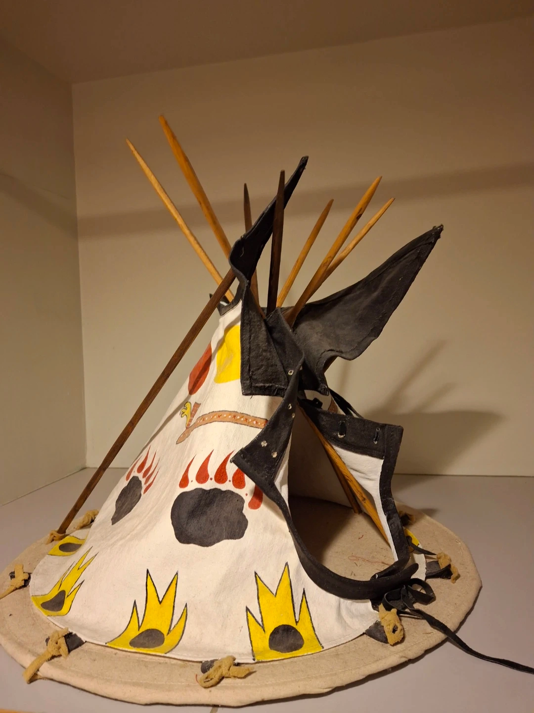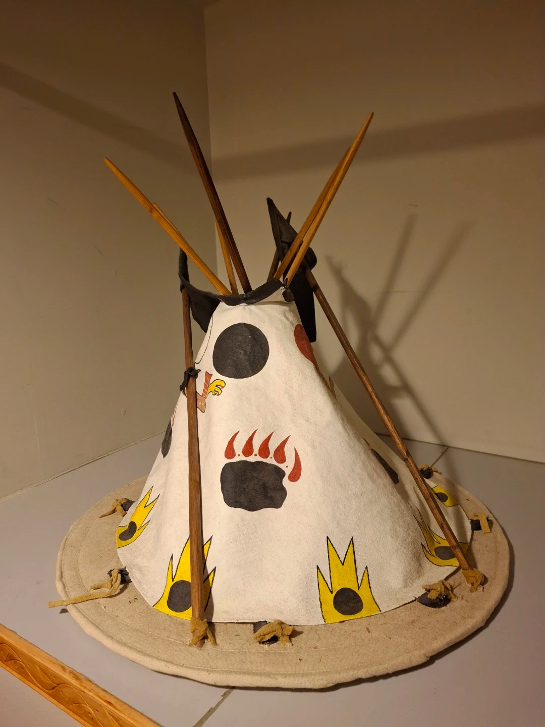 Check out this handmade decorative teepee! It features a unique design with bear paw prints and other eye-catching details. Perfect for adding a touch of whimsy to any room or for imaginative play. I have used it to store my smudge. It sits on a base 21.5" wide & 21" high.