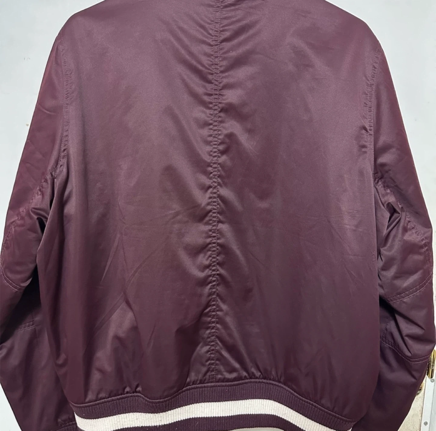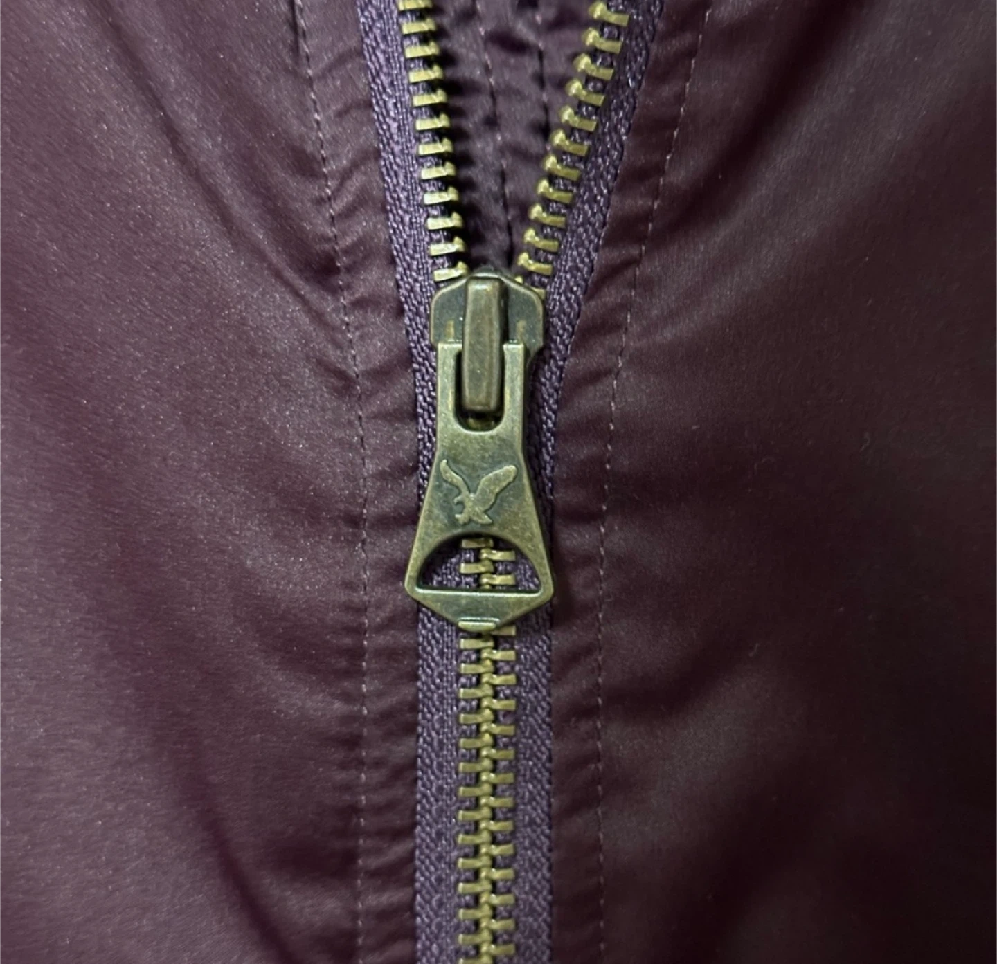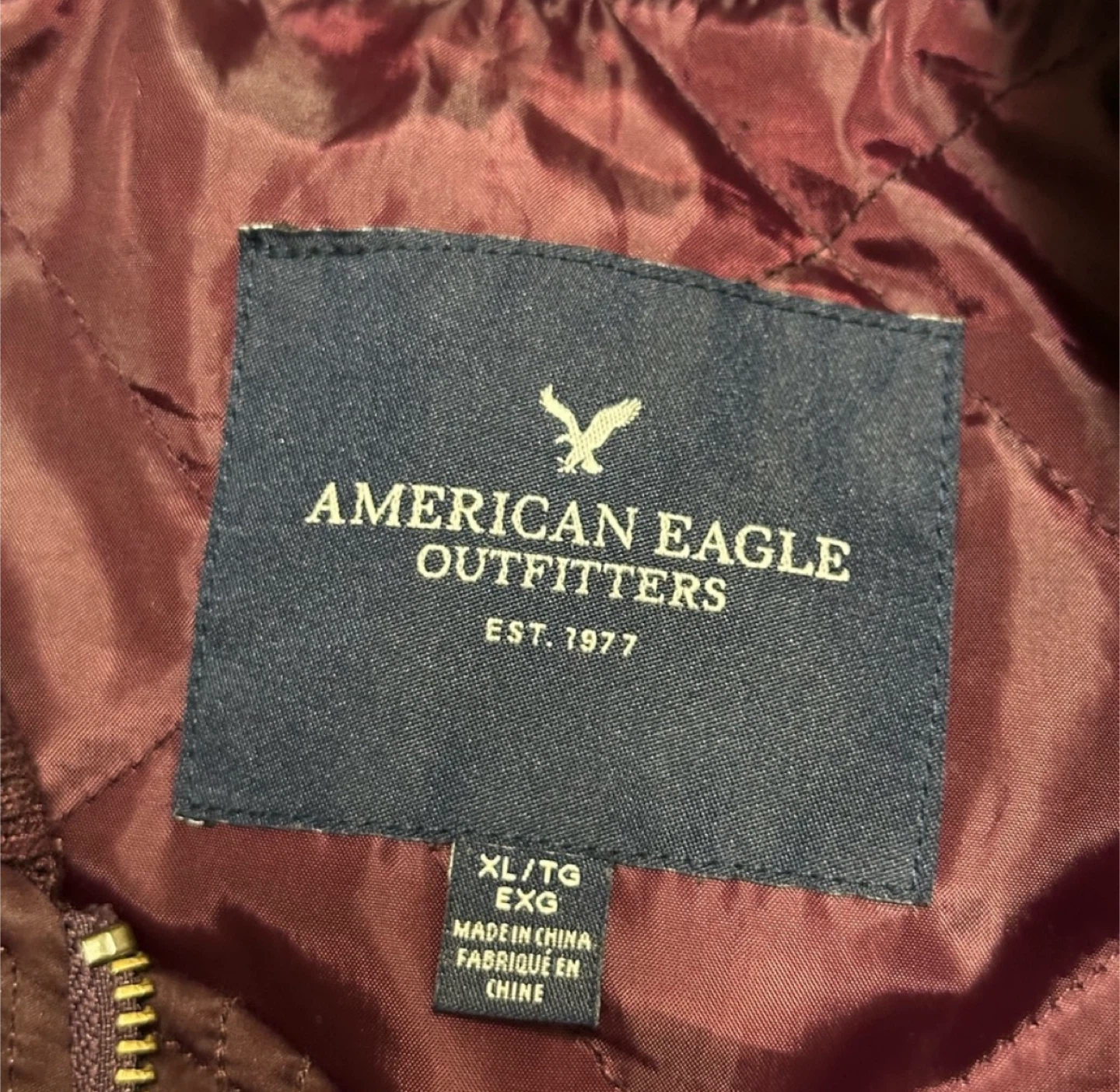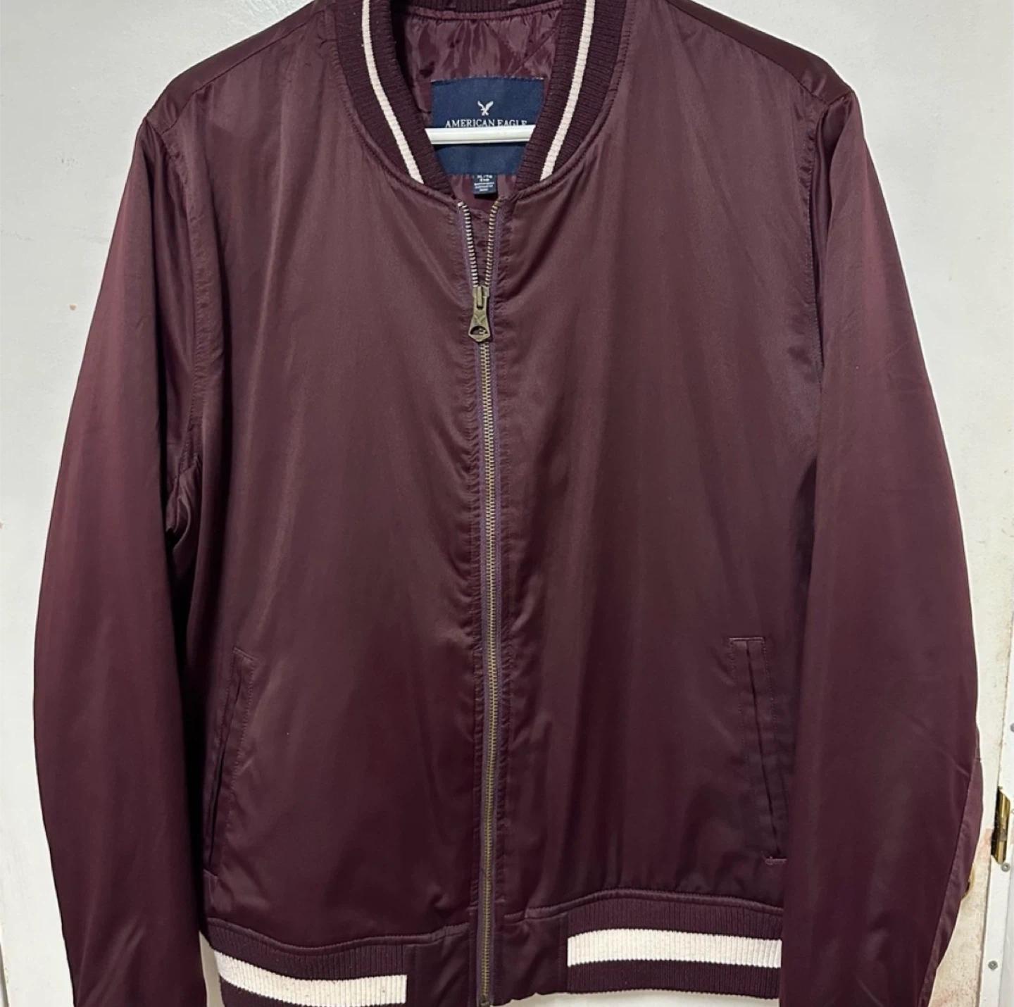 Selling a stylish American Eagle Outfitters bomber jacket! It's in great shape and a size XL. The jacket is a nice burgundy colour with white stripes on the collar, cuffs, and hem.