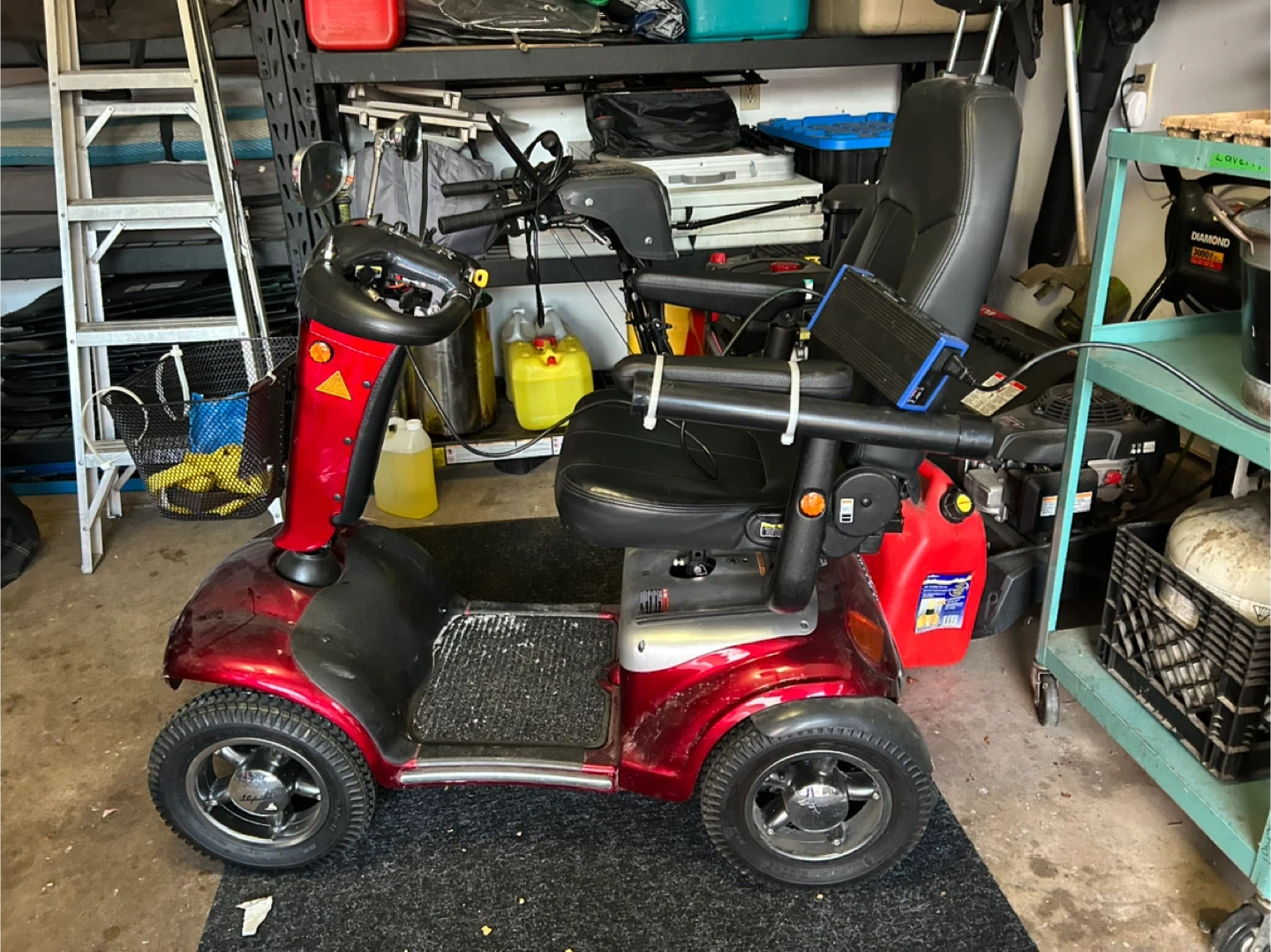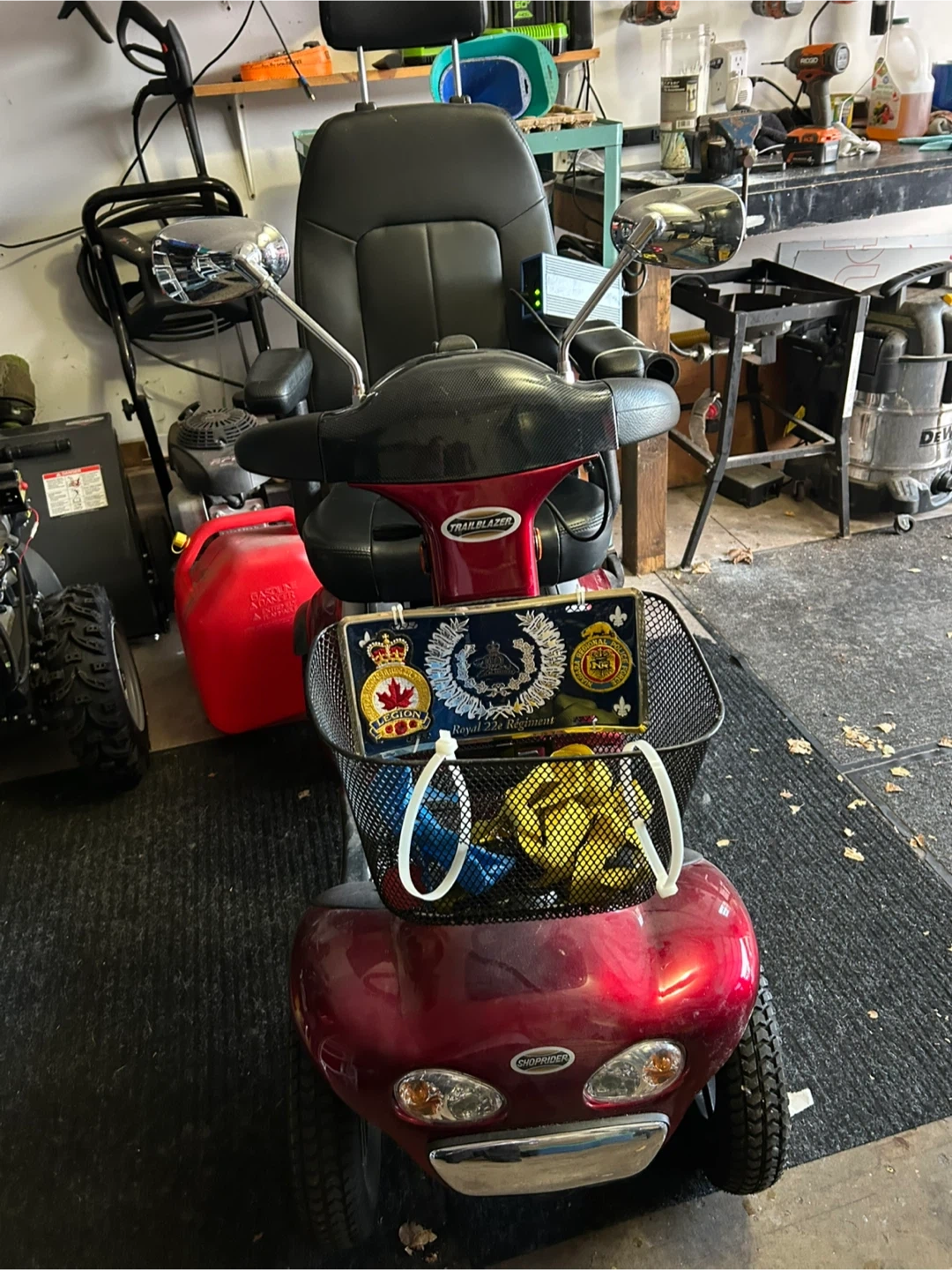 Selling a red Trailblazer mobility scooter. It is in good condition and ready to go! It has a comfortable seat, mirrors, and a front basket for storage