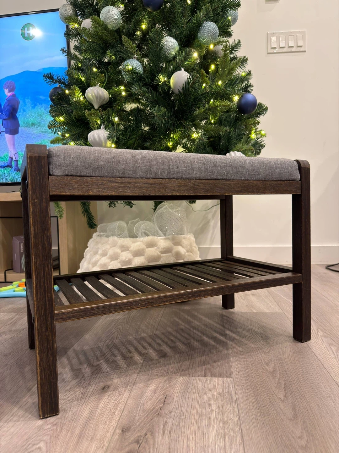 Solid wooden bench with a comfortable padded seat and a lower slatted shelf for storage. Perfect for an entryway, hallway, bedroom, living room, mudroom, or garage.