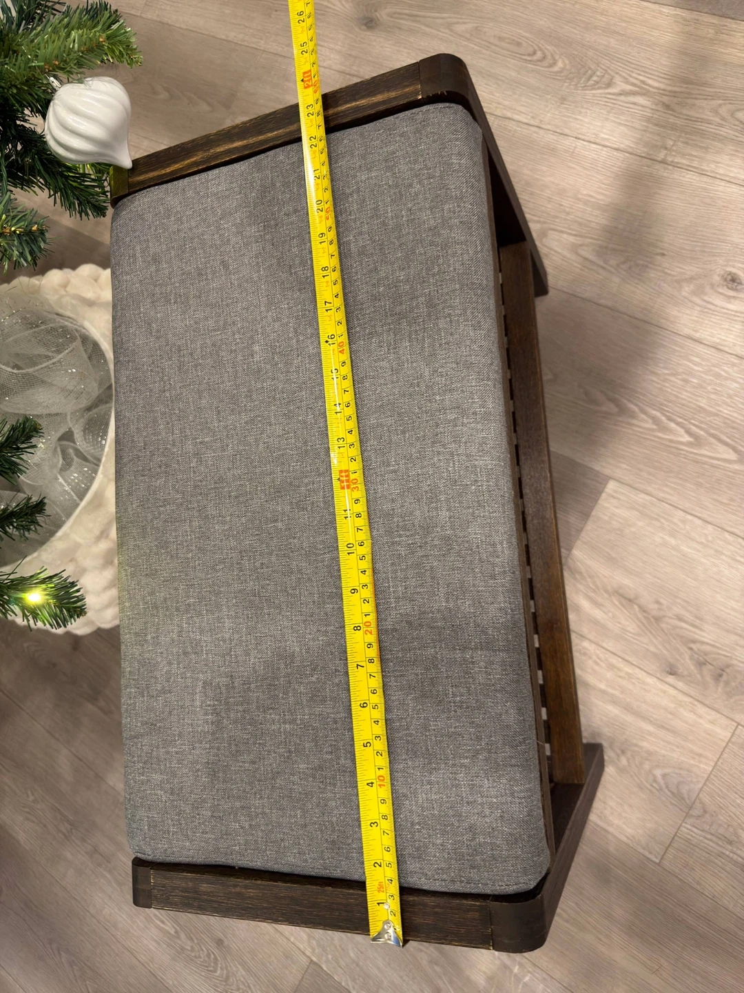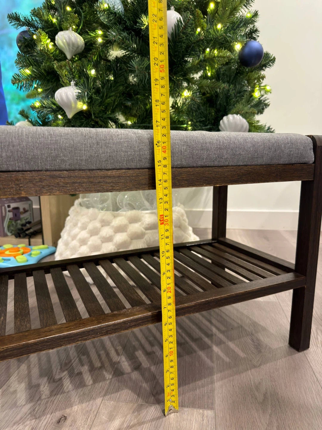 Solid wooden bench with a comfortable padded seat and a lower slatted shelf for storage. Perfect for an entryway, hallway, bedroom, living room, mudroom, or garage.