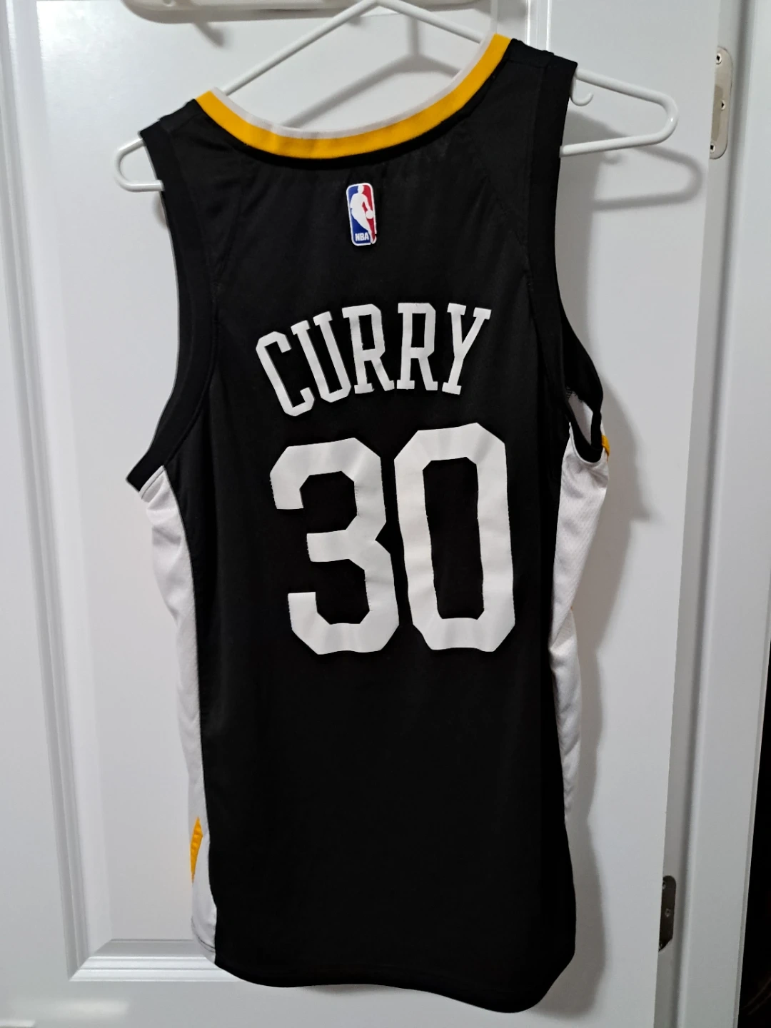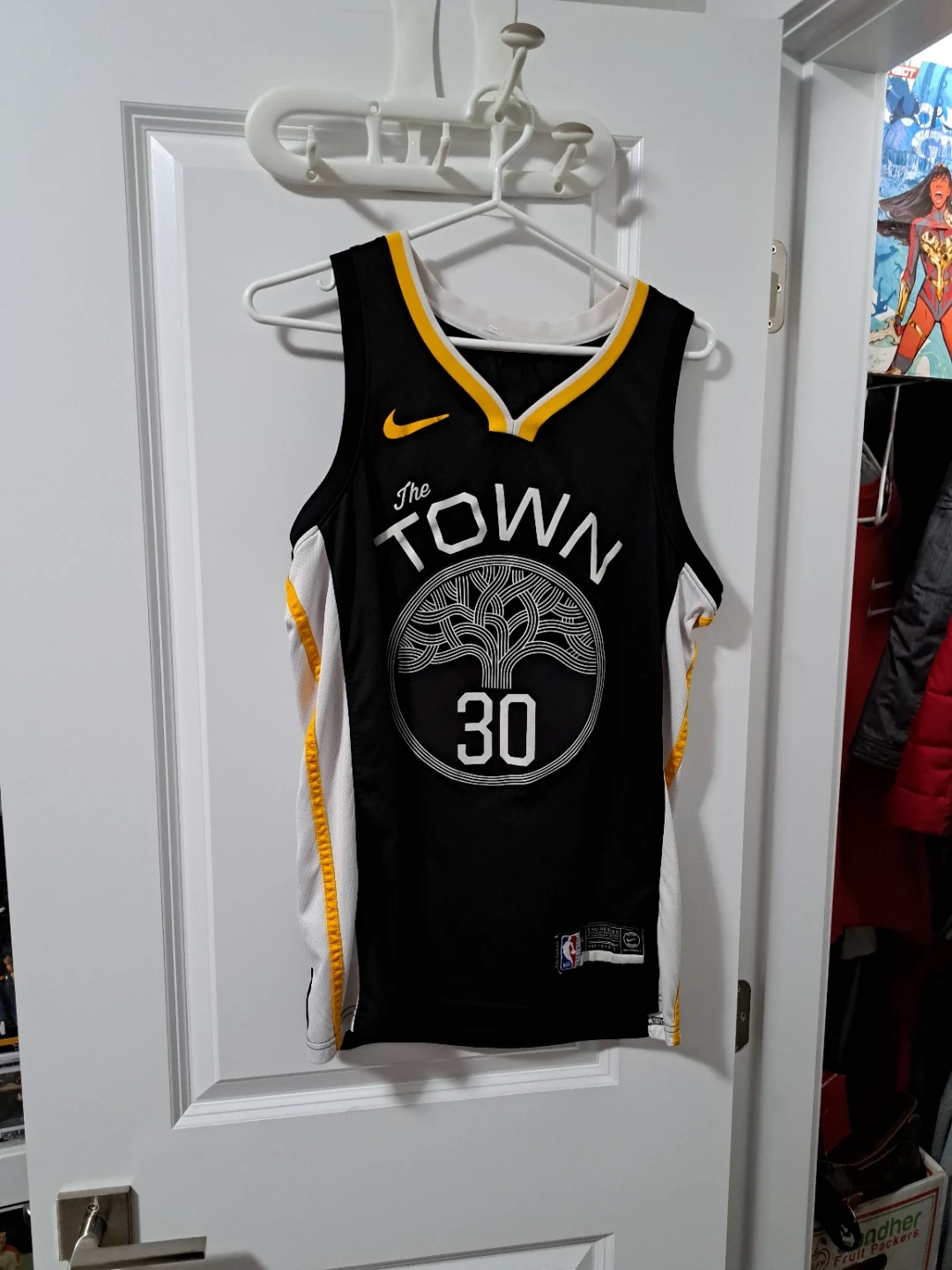 Selling a Nike NBA Stephen Curry jersey. It's black with gold and white accents, featuring "The Town" design on the front and Curry's number 30 on both sides. Size is 44.