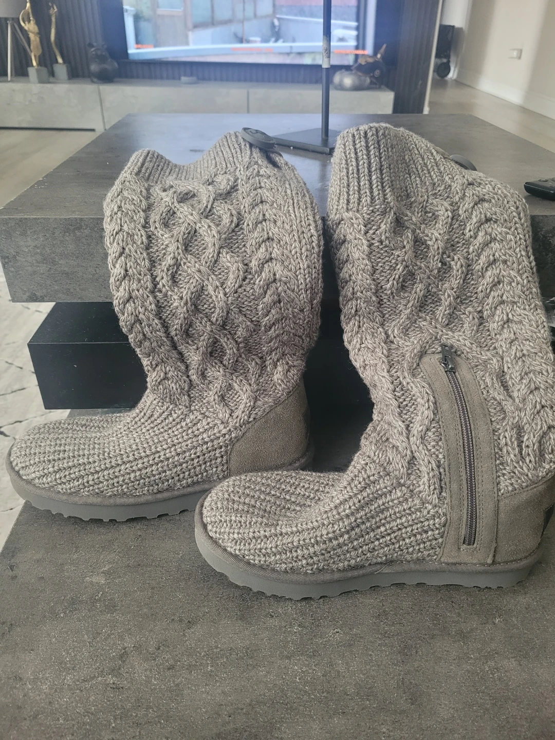 Cozy UGG boots with a stylish cable knit design! These are in great condition and perfect for keeping your feet warm during the colder months. They feature a zipper for easy wear and the classic UGG comfort you know and love