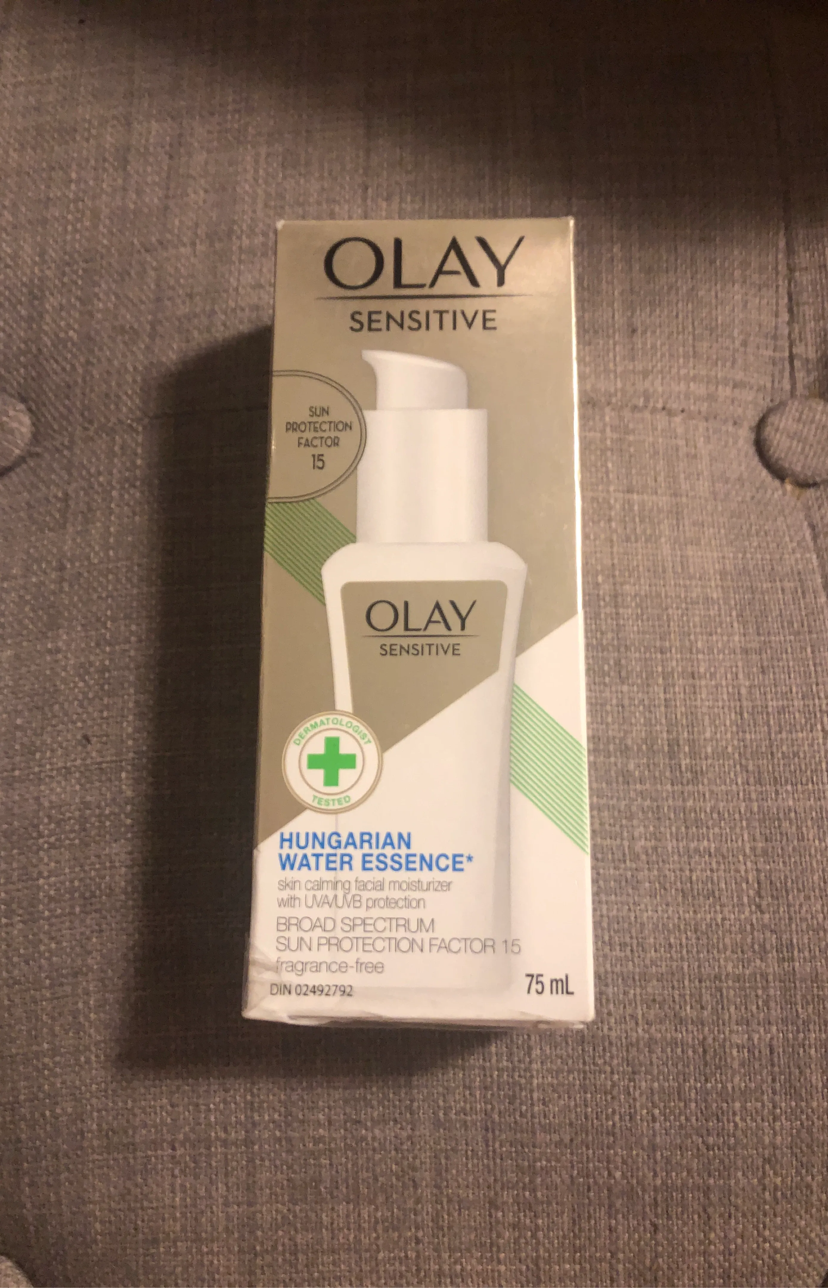 Selling a bottle of OLAY Sensitive Hungarian Water Essence with SPF 15. This fragrance-free moisturizer provides broad spectrum sun protection and is dermatologist tested. It comes in a 75 mL bottle. Perfect for sensitive skin!